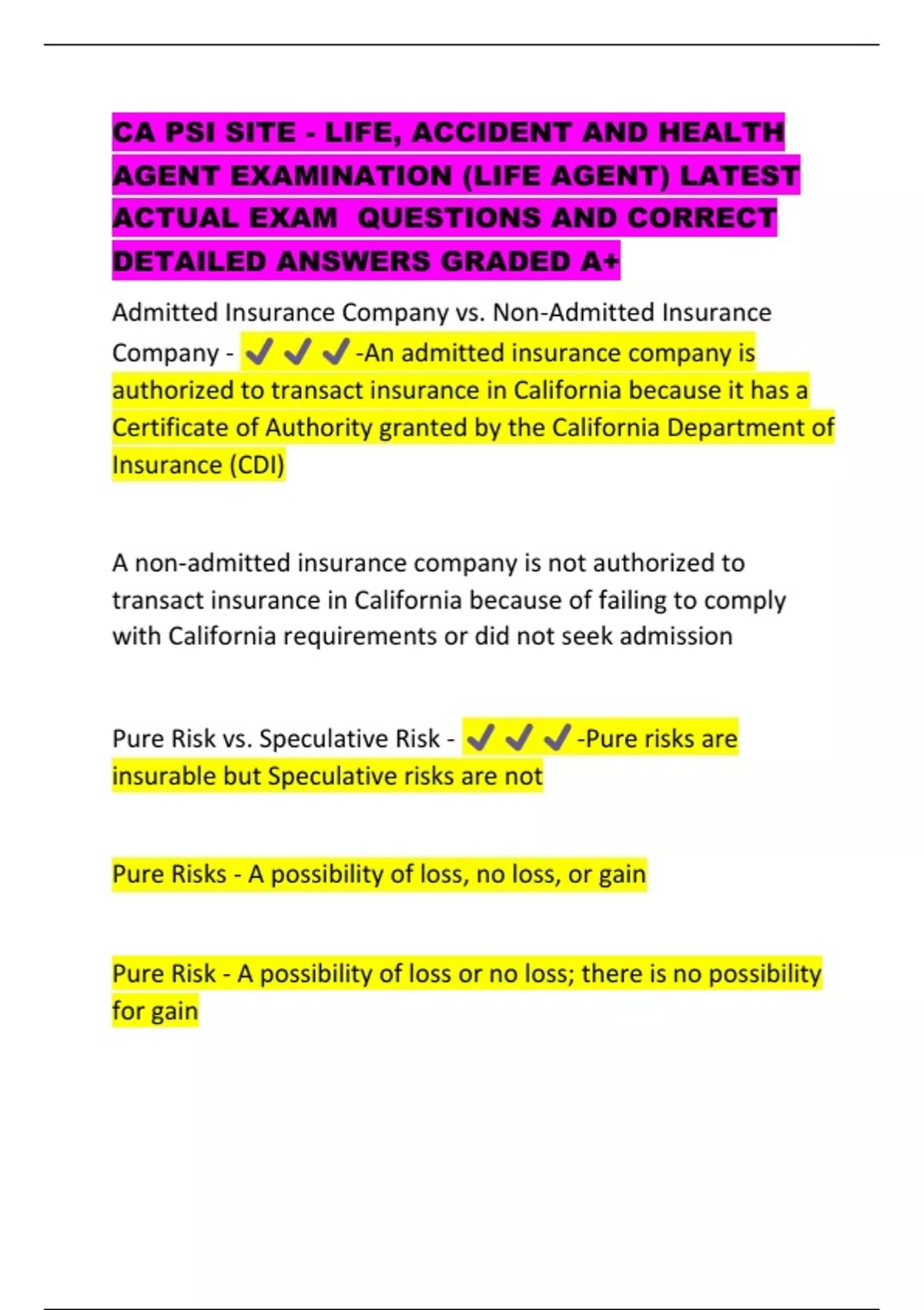 CA PSI SITE - LIFE, ACCIDENT AND HEALTH AGENT EXAMINATION (LIFE AGENT) LATEST ACTUAL EXAM QUESTIONS AND CORRECT DETAILED ANSWERS GRADED A+