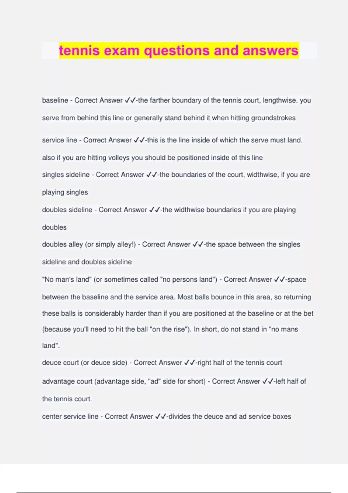 tennis exam questions and answers baseline - Correct Answer ️️ -the farther boundary of the tennis court, lengthwise. you serve from behind this line or generally stand behind it when hitting groundstrokes service line - Correct Answer ️️ -this is the line inside of which the serve must land. also if you are hitting volleys you should be positioned inside of this line singles sideline - Correct Answer ️️ -the boundaries of the court, widthwise, if you are playing singles doubles sideline - Correct Answer ️️ -the widthwise boundaries if you are playing doubles doubles alley (or simply alley!) - Correct Answer ️️ -the space between the singles sideline and doubles sideline "No man's land" (or sometimes called "no persons land") - Correct Answer ️️ -space between the baseline and the service area. Most balls bounce in this area, so returning these balls is considerably harder than if you are positioned at the baseline or at the bet (because you'll need to hit the ball "on the rise"). In short, do not