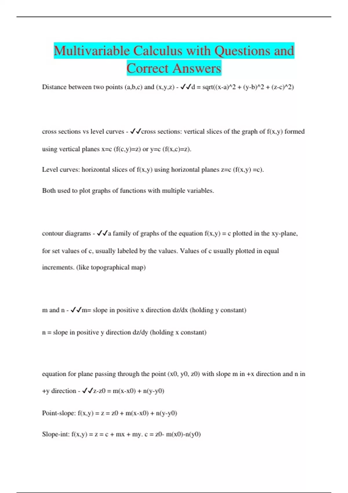 Distance between two points (a,b,c) and (x,y,z) - d = sqrt((x-a)^2 + (y-b)^2 + (z-c)^2) cross sections vs level curves - cross sections: vertical slices of the graph of f(x,y) formed using vertical planes x=c (f(c,y)=z) or y=c (f(x,c)=z). Level curves: horizontal slices of f(x,y) using horizontal planes z=c (f(x,y) =c). Both used to plot graphs of functions with multiple variables. contour diagrams - a family of graphs of the equation f(x,y) = c plotted in the xy-plane, for set values of c, usually labeled by the values. Values of c usually plotted in equal increments. (like topographical map) m and n - m= slope in positive x direction dz/dx (holding y constant)
