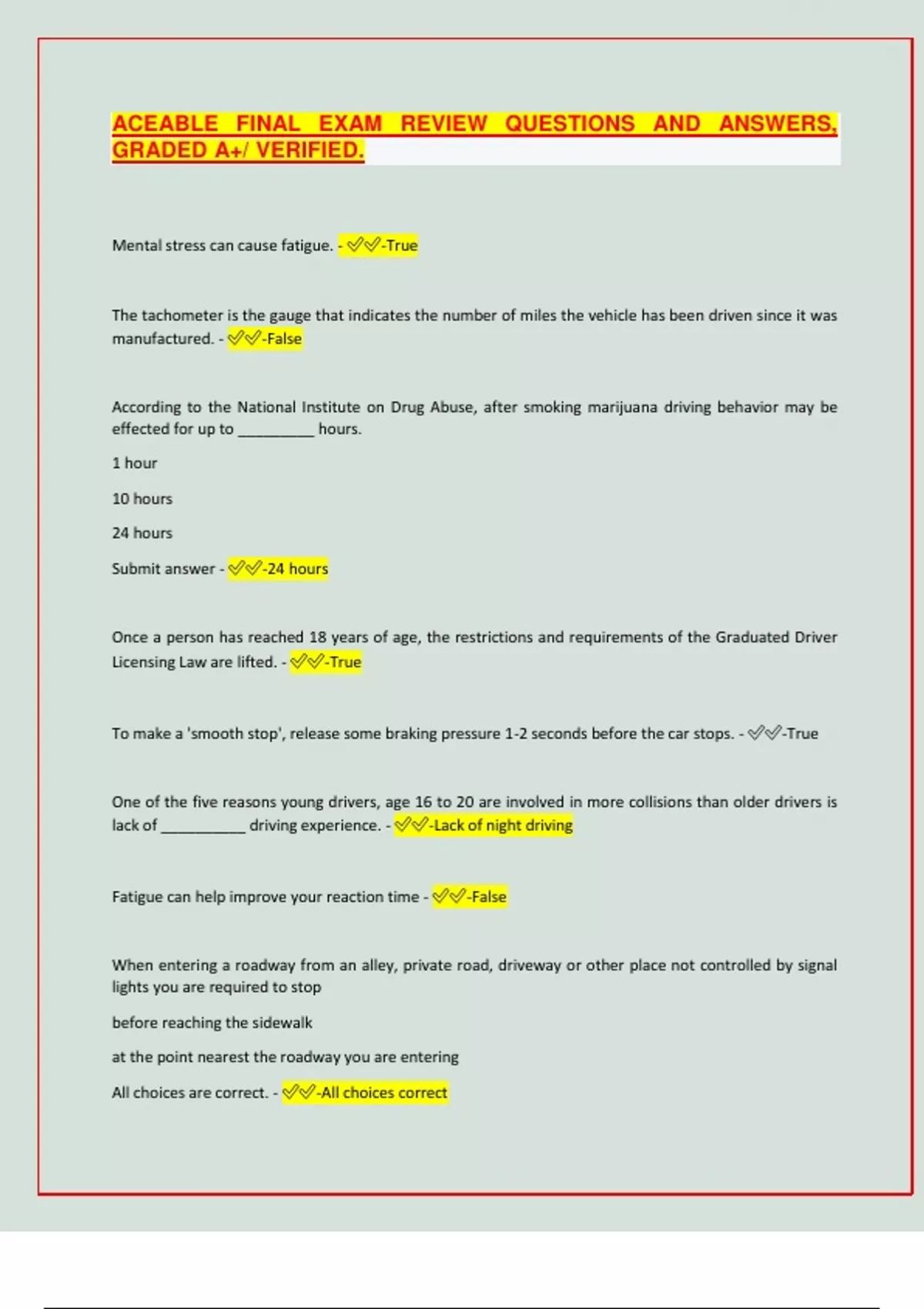 ACEABLE FINAL EXAM REVIEW QUESTIONS AND ANSWERS, GRADED A+/ VERIFIED. Mental stress can cause fatigue. - -True The tachometer is the gauge that indicates the number of miles the vehicle has been driven since it was manufactured. - -False According to the National Institute on Drug Abuse, after smoking marijuana driving behavior may be effected for up to _________ hours. 1 hour 10 hours 24 hours Submit answer - -24 hours Once a person has reached 18 years of age, the restrictions and requirements of the Graduated Driver Licensing Law are lifted. - -True To make a 'smooth stop', release some braking pressure 1-2 seconds before the car stops. - -True One of the five reasons young drivers, age 16 to 20 are involved in more collisions than older drivers is lack of __________ driving experience. - -Lack of night driving Fatigue can help improve your reaction time - -False When entering a roadway from an alley, private road, driveway or other place not controlled by signal lights you are required to stop before reaching the sidewalk at the point nearest the roadway you are entering All choices are correct. - -All choices correct You are stopped at an intersection waiting to cross it. When checking for an opening in traffic the driver should: - -b. Look left , then right, then left again