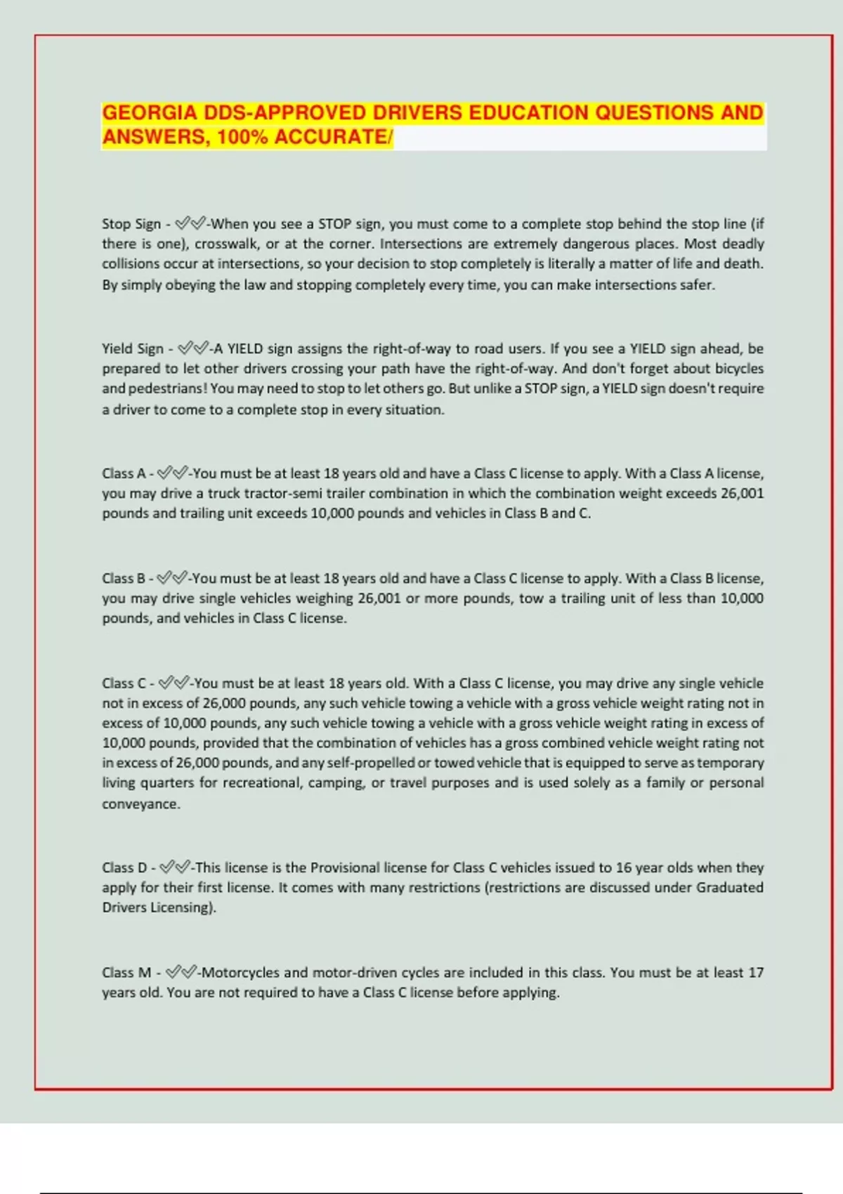 GEORGIA DDS-APPROVED DRIVERS EDUCATION QUESTIONS AND ANSWERS, 100% ACCURATE/ Stop Sign - -When you see a STOP sign, you must come to a complete stop behind the stop line (if there is one), crosswalk, or at the corner. Intersections are extremely dangerous places. Most deadly collisions occur at intersections, so your decision to stop completely is literally a matter of life and death. By simply obeying the law and stopping completely every time, you can make intersections safer. Yield Sign - -A YIELD sign assigns the right-of-way to road users. If you see a YIELD sign ahead, be prepared to let other drivers crossing your path have the right-of-way. And don't forget about bicycles and pedestrians! You may need to stop to let others go. But unlike a STOP sign, a YIELD sign doesn't require a driver to come to a complete stop in every situation. Class A - -You must be at least 18 years old and have a Class C license to apply. With a Class A license, you may drive a truck tractor-semi trailer combination in which the combination weight exceeds 26,001 pounds and trailing unit exceeds 10,000 pounds and vehicles in Class B and C. Class B - -You must be at least 18 years old and have a Class C license to apply. With a Class B license, you may drive single vehicles weighing 26,001 or more pounds, tow a trailing unit of less than 10,000 pounds, and vehicles in Class C license. Class C - -You must be at least 18 years old. With a Class C license, you may drive any single vehicle not in excess of 26,000 pounds, any such vehicle towing a vehicle with a gross vehicle weight rating not in excess of 10,000 pounds, any such vehicle towing a vehicle with a gross vehicle weight rating in excess of 10,000 pounds, provided that the combination of vehicles has a gross combined vehicle weight rating not in excess of 26,000 pounds, and any self-propelled or towed vehicle that is equipped to serve as temporary living quarters for recreational, camping, or travel purposes and is used solely as a family or personal conveyance. Class D - -This license is the Provisional license for Class C vehicles issued to 16 year olds when they apply for their first license. It comes with many restrictions (restrictions are discussed under Graduated Drivers Licensing). Class M - -Motorcycles and motor-driven cycles are included in this class. You must be at least 17 years old. You are not required to have a Class C license before applying