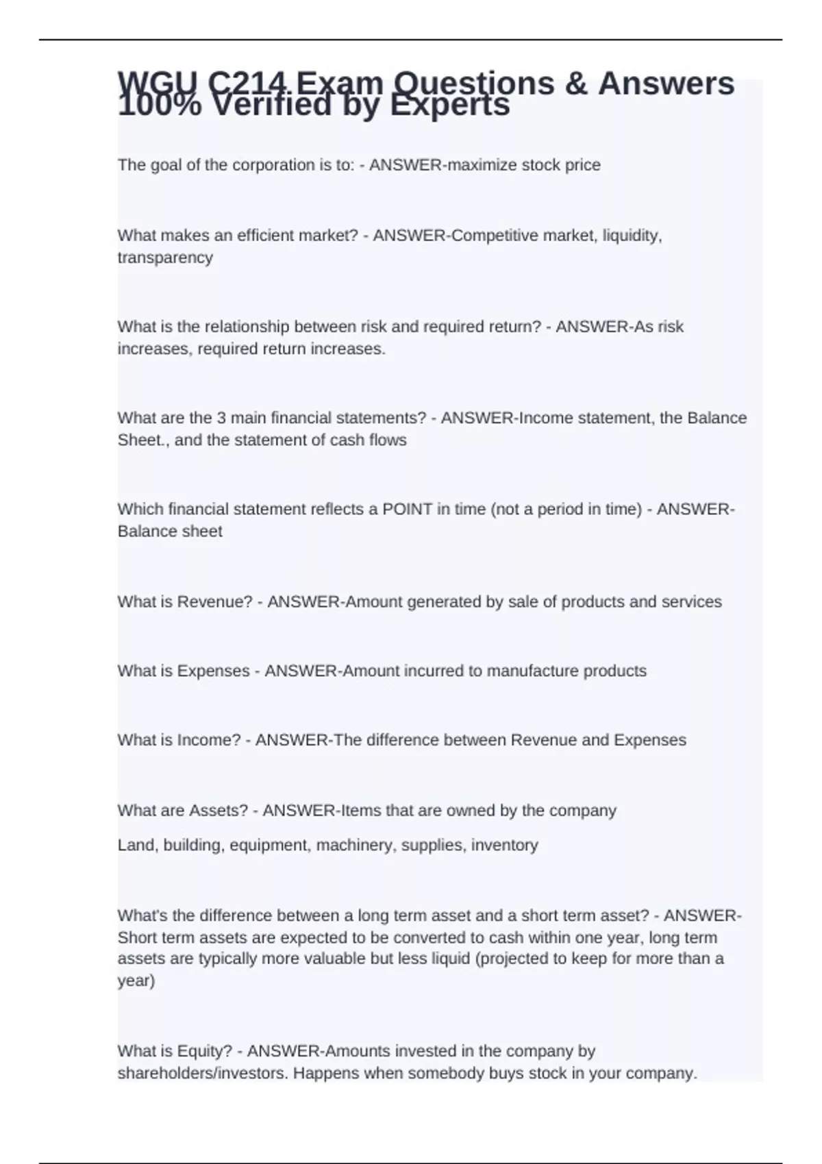 The goal of the corporation is to: - ANSWER-maximize stock price What makes an efficient market? - ANSWER-Competitive market, liquidity, transparency What is the relationship between risk and required return? - ANSWER-As risk increases, required return increases. What are the 3 main financial statements? - ANSWER-Income statement, the Balance Sheet., and the statement of cash flows Which financial statement reflects a POINT in time (not a period in time) - ANSWER-Balance sheet What is Revenue? - ANSWER-Amount generated by sale of products and services What is Expenses - ANSWER-Amount incurred to manufacture products What is Income? - ANSWER-The difference between Revenue and Expenses What are Assets? - ANSWER-Items that are owned by the company Land, building, equipment, machinery, supplies, inventory What's the difference between a long term asset and a short term asset? - ANSWER-Short term assets are expected to be converted to cash within one year, long term assets are typically more valuable but less liquid (projected to keep for more than a year)