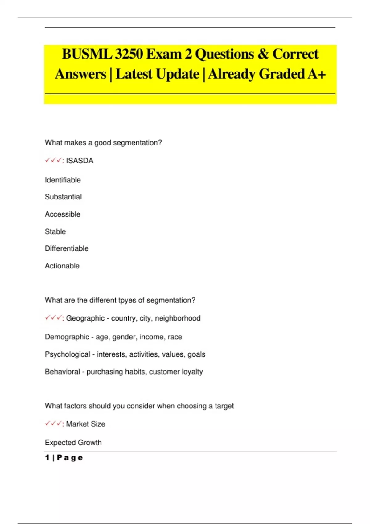 What makes a good segmentation? : ISASDA Identifiable Substantial Accessible Stable Differentiable Actionable What are the different tpyes of segmentation? : Geographic - country, city, neighborhood Demographic - age, gender, income, race Psychological - interests, activities, values, goals Behavioral - purchasing habits, customer loyalty What factors should you consider when choosing a target : Market Size Expected Growth 2 | P a g e Competitive position Cost of reaching Company compatibility What is the difference between positioning and position? : Positioning - act of designing the company's offering and image to occupy a distinctive place in the mind of the target market. - simplicity - alignment - value creation Position - cold-hearted, no-nonsense statement of how you are perceived in the minds of your prospects. How is a brands po