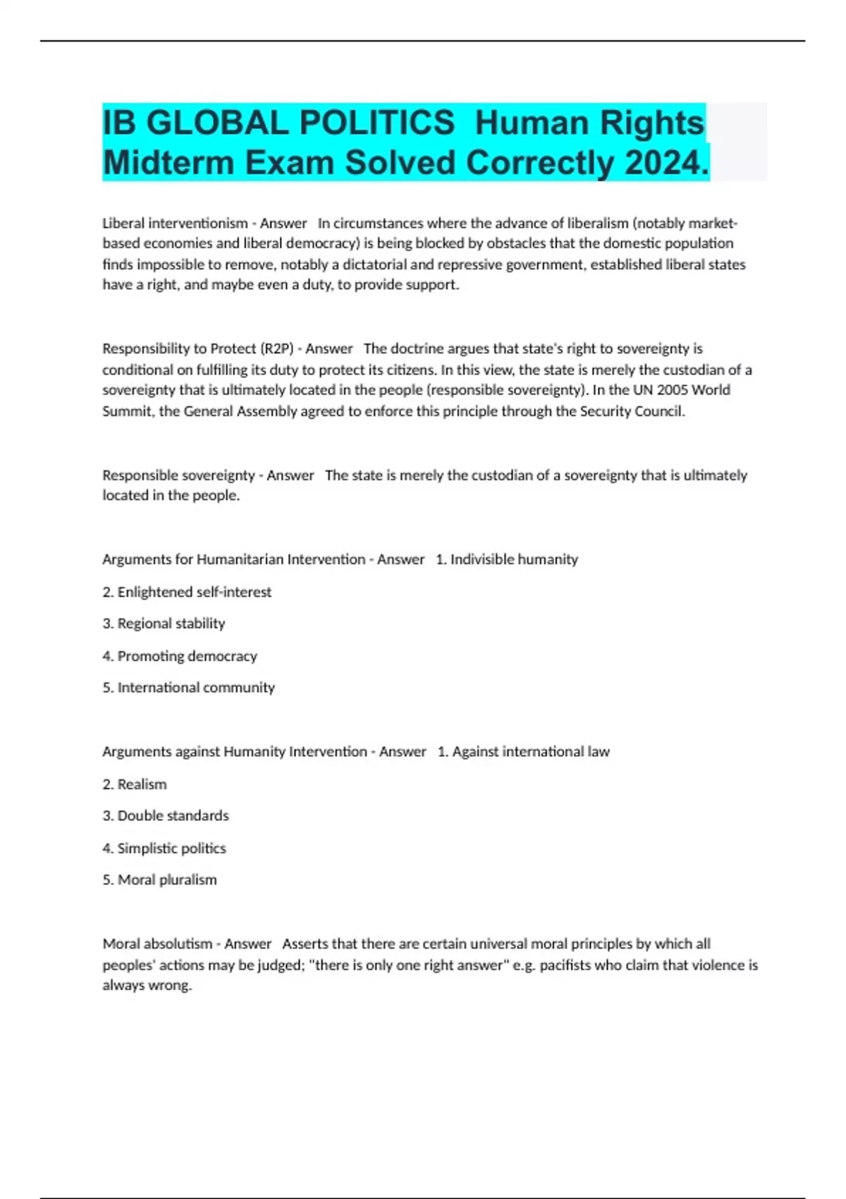 IB GLOBAL POLITICS Human Rights Midterm Exam Solved Correctly 2024.