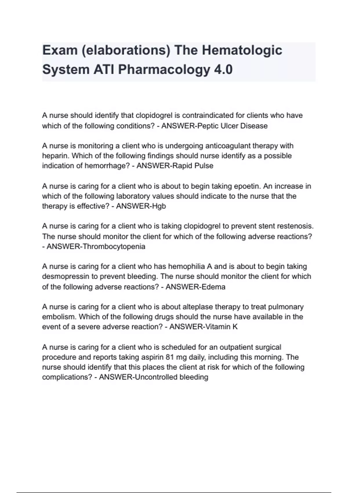 Exam (elaborations) The Hematologic System ATI Pharmacology 4.0 with complete solution