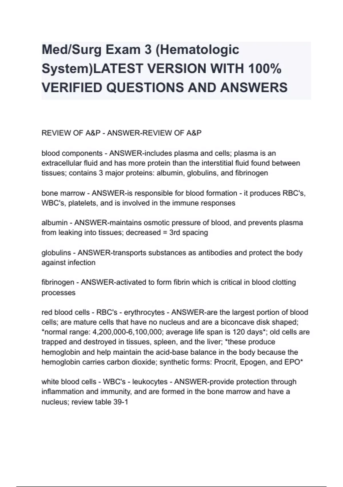 Med Surg Exam 3 (Hematologic System)LATEST VERSION WITH 100% VERIFIED with complete solution