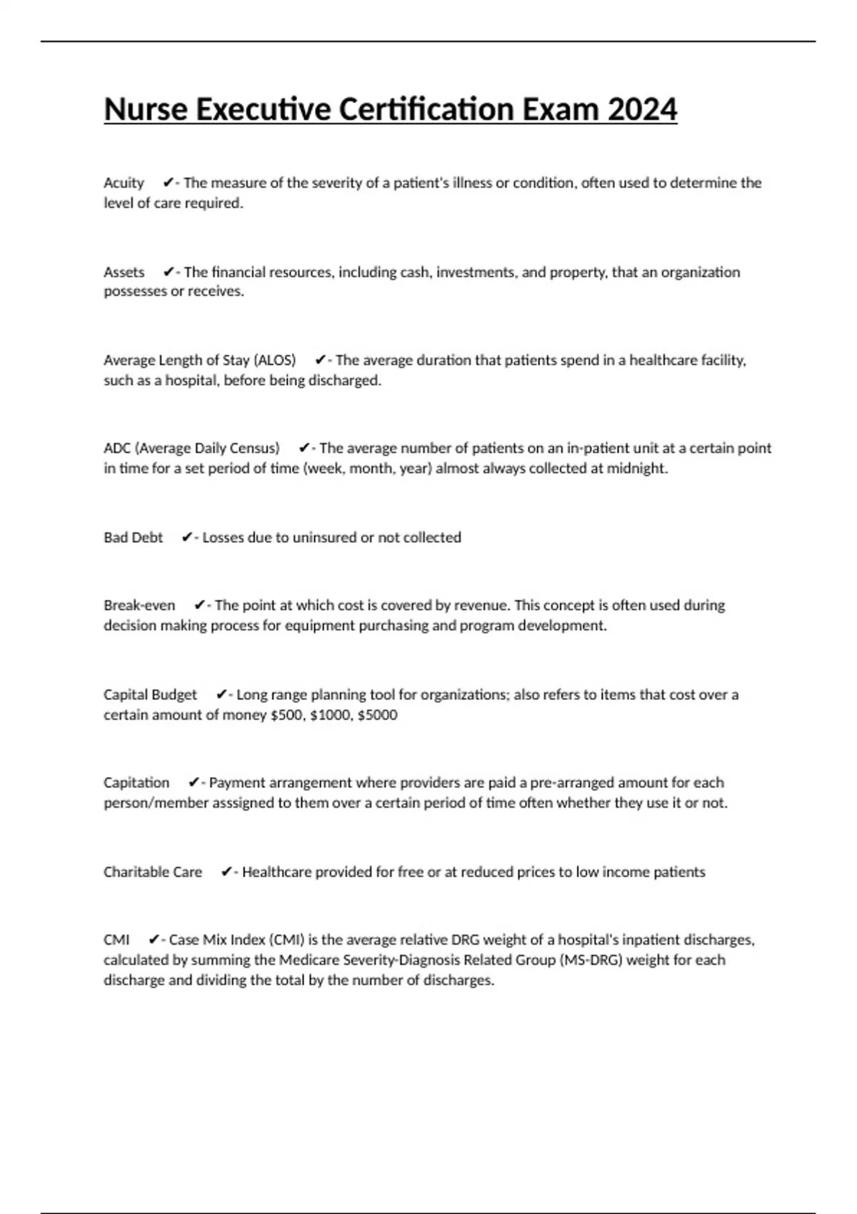 Acuity - The measure of the severity of a patient's illness or condition, often used to determine the level of care required. Assets - The financial resources, including cash, investments, and property, that an organization possesses or receives. Average Length of Stay (ALOS) - The average duration that patients spend in a healthcare facility, such as a hospital, before being discharged. ADC (Average Daily Census) - The average number of patients on an in-patient unit at a certain point in time for a set period of time (week, month, year) almost always collected at midnight. Bad Debt - Losses due to uninsured or not collected Break-even - The point at which cost is covered by revenue. This concept is often used during decision making process for equipment purchasing and program development. Capital Budget - Long range planning tool for organizations; also refers to items that cost over a certain amount of money $500, $1000, $5000 Capitation - Payment arrangement where providers are paid a pre-arranged amount for each person/member asssigned to them over a certain period of time often whether they use it or not. Charitable Care - Healthcare provided for free or at reduced prices to low income patients CMI - Case Mix Index (CMI) is the average relative DRG weight of a hospital's inpatient discharges, calculated by summing the Medicare Severity-Diagnosis Related Group (MS-DRG) weight for each discharge and dividing the total by the number of discharges. What does CMI reflect? - Reflects the diversity, clinical complexity and resource needs of all the patients in the hospital. What does a higher CMI indicate? - Indicates a more complex and resource-intensive case load. Contribution Margin - The profit that is contributed by a cost center without the indirect costs. Cost-Benefit Ratio - A way for an organization or department to weigh/analyze the cost of an item/project/program with the benefit. Analysis may include non-monetary value such as charity care and community benefit. Depreciation - Amount written off annually on a piece of equipment and buildings. Direct Costs - Costs that can be attributed to a specific item or cost in a department's or projects budget. Examples include salaries, admission kits etc. DRG (Diagnosis Related Groups) - Categories of diagnoses defined by Medicare for payment purposes Fiscal year - The period of time or cycle that a 12-month budget addresses. Most common cycles include calendar year January 1st-Dec 31st or academic year Sept 1-Aug 31st Fixed Expenses - Remains the same regardless of the number of patients such as mortgage or loan payments Forecasting - The process by which a department or organization translates future needs of a new program or budget into resource needs and financial terms. FTE (Full Time Equivalent) - 2080 hours in a year for a 40-hour work week (may be different for other types of shifts). Gross Revenue - Could be gross patient revenue; total amount of hospital charges Hours per Patient Day (HPPD) - # of hours worked/# of patient days (See NHPPD below) Indirect Costs/Expenses - Cost not directly chargeable to one cost center or activity such as housekeeping and office supplies. Liabilities - Financial obligations of an organization I.e. bills