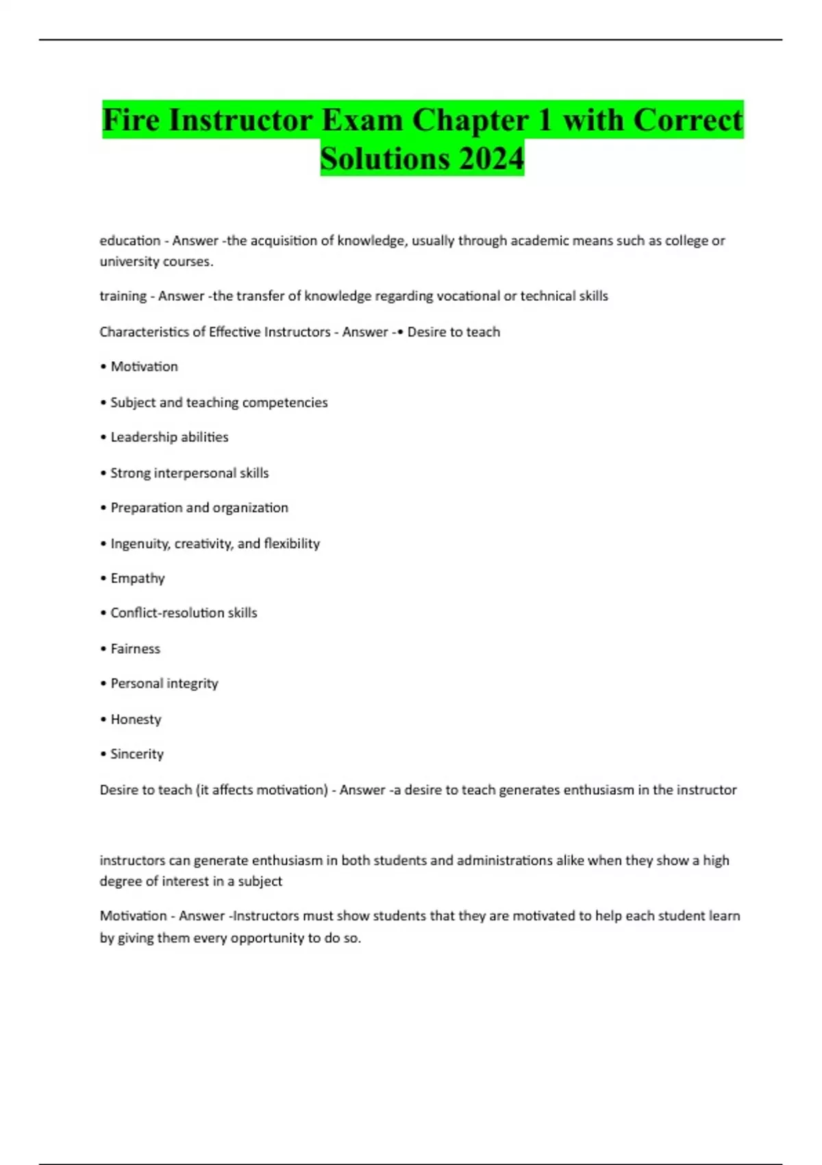 Fire Instructor Exam Chapter 1 with Correct Solutions 2024 education - Answer -the acquisition of knowledge, usually through academic means such as college or university courses. training - Answer -the transfer of knowledge regarding vocational or technical skills Characteristics of Effective Instructors - Answer -• Desire to teach • Motivation • Subject and teaching competencies • Leadership abilities • Strong interpersonal skills • Preparation and organization • Ingenuity, creativity, and flexibility • Empathy • Conflict-resolution skills • Fairness • Personal integrity • Honesty • Sincerity Desire to teach (it affects motivation) - Answer -a desire to teach generates enthusiasm in the instructor instructors can generate enthusiasm in both students and administrations alike when they show a high degree of interest in a subject Motivation - Answer -Instructors must show students that they are motivated to help each student learn by giving them every opportunity to do so.