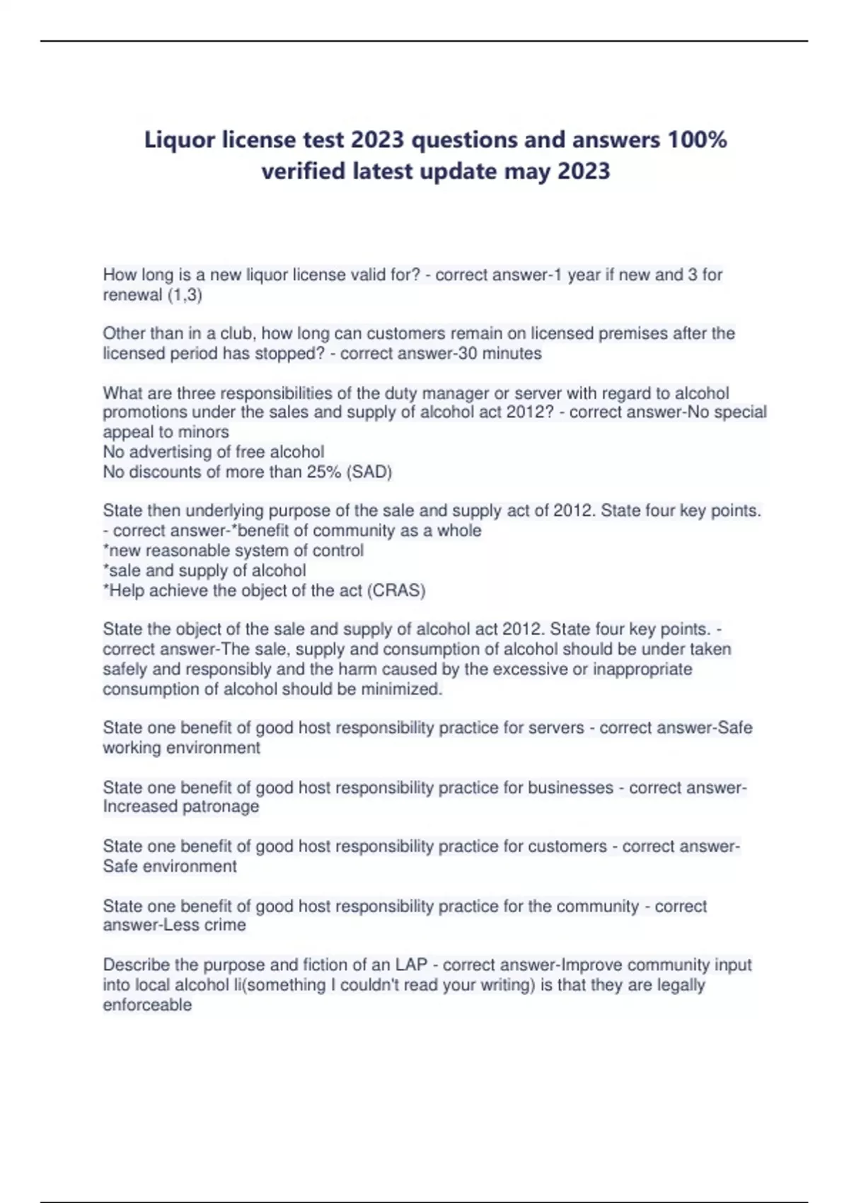 Liquor license test 2023 questions and answers 100% verified latest update may 2023 How long is a new liquor license valid for? - correct answer-1 year if new and 3 for renewal (1,3) Other than in a club, how long can customers remain on licensed premises after the licensed period has stopped? - correct answer-30 minutes What are three responsibilities of the duty manager or server with regard to alcohol promotions under the sales and supply of alcohol act 2012? - correct answer-No special appeal to minors No advertising of free alcohol No discounts of more than 25% (SAD) State then underlying purpose of the sale and supply act of 2012. State four key points. - correct answer-*benefit of community as a whole *new reasonable system of control *sale and supply of alcohol *Help achieve the object of the act (CRAS) State the object of the sale and supply of alcohol act 2012. State four key points. - correct answer-The sale, supply and consumption of alcohol should be under taken safely and responsibly and the harm caused by the excessive or inappropriate consumption of alcohol should be minimized. State one benefit of good host responsibility practice for servers - correct answer-Safe working environment State one benefit of good host responsibility practice for businesses - correct answerIncreased patronage State one benefit of good host responsibility practice for customers - correct answerSafe environment State one benefit of good host responsibility practice for the community - correct answer-Less crime Describe the purpose and fiction of an LAP - correct answer-Improve community input into local alcohol li(something I couldn't read your writing) is that they are legally enforceable List three criteria that may be included in the scope of a Lical Alcohol Policy - correct answer-Locating of premises Types of licence Maximum hours Number of licences issued. One way door Explain the structure and responsibilities of Alcohol Regulatory licensing Authority - correct answer-Structure- three district court judges- five year term Responsibility - administers the act at a national level Explain the structure and responsibilities of district licensing commitee - correct answerThree appointed members included chair person Responsibility - monitors alcohol licences at a local level Explain the structure and role of an inspector in relation to unopposed and oppose applications for a managers cert - correct answer-Structure- part of alcohol licencing team appointed by dcc Role- reads and writes a report on your managers certificate application within 15 days Explain the structure and role of the police in relation to unopposed and oppose applications for a managers cert - correct answer-Structure- alcohol harm reduction unit Role- criminal check on suitability of applicant Explain the structure and role of community public health in relation to unopposed and oppose applications for a managers cert - correct answer-Structure - to officers delegated their authority by medical officer of health List four items other than the fee and the copies of the application that must accompany the application or renewal form for an on, off club and/or special license - correct answer-Coc Host responsibility policy Hour plan Menu Photograph of exterior Certificate of incorporation What two actions would an applicant news to take in order to be issued with an on, off and/or club license - correct answer-Public notices in the local newspaper a4 notice on premise publish on line on a dcc website What is the minimum time before it is needed that an application for a special license must be received by the district licensing commitee - correct answer-20 working days Special licences have various conditions that pertain to the premises that require them. State two reasons why a licensed premise would make an application for a special license - correct answer-Outside hours and outside areas Explain what type of licence an off licence is - correct answer-Alcohol taken off premise Describe one compulsory condition that applies to supermarkets and grocery stores that hold an off licence - correct answer-Limits display and promotion of alcohol to a single area Describe two circumstances when police or a licensing inspector can make an application under the sale and supply of alcohol act 2012 for a variation, suspension or cancellation of a liquor license - correct answer-Sale of Alcohol to minors or intoxicated people Licence not lit and proper obno