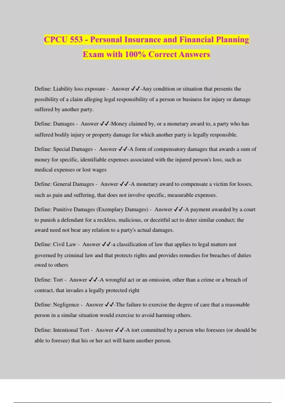 CPCU 553 - Personal Insurance and Financial Planning Exam with 100% Correct Answers Define: Liability loss exposure - Answer ️️ -Any condition or situation that presents the possibility of a claim alleging legal responsibility of a person or business for injury or damage suffered by another party. Define: Damages - Answer ️️ -Money claimed by, or a monetary award to, a party who has suffered bodily injury or property damage for which another party is legally responsible. Define: Special Damages - Answer ️️ -A form of compensatory damages that awards a sum of money for specific, identifiable expenses associated with the injured person's loss, such as medical expenses or lost wages Define: General Damages - Answer ️️ -A monetary award to compensate a victim for losses, such as pain and suffering, that does not involve specific, measurable expenses. Define: Punitive Damages (Exemplary Damages) - Answer ️️ -A payment awarded by a court to punish a defendant for a reckless, malicious, or deceitful act to deter similar conduct; the award need not bear any relation to a party's actual damages. Define: Civil Law - Answer ️️ -a classification of law that applies to legal matters not governed by criminal law and that protects rights and provides remedies for breaches of duties owed to others Define: Tort - Answer ️️ -A wrongful act or an omission, other than a crime or a breach of contract, that invades a legally protected right Define: Negligence - Answer ️️ -The failure to exercise the degree of care that a reasonable person in a similar situation would exercise to avoid harming others. Define: Intentional Tort - Answer ️️ -A tort committed by a person who foresees (or should be able to foresee) that his or her act will harm another person. Define: Strict (Absolute) Liability - Answer ️️ -Liability imposed by a court or by a statute in the absence of fault when harm results from activities or conditions that are extremely dangerous, unnatural, ultrahazardous, extraordinary, abnormal, or inappropriate. Define: Risk Management Process - Answer ️️ -The method of making, implementing, and monitoring decisions that minimize the adverse effects of risk on an organization Assets exposed to liability loss include: - Answer ️️ -all currently owned financial assets, and potentially some future income What is a cause of a liability loss? - Answer ️️ -claim for money damages Intentional Torts - Answer ️️ -Defamation (libel if written, slander if spoken) Assault (threat of touching) Battery (actual touching) Trespass (unauthorized use of another's land) Nuisance (interfering with peaceful enjoyment of property) Three financial consequences that might result from liability loss - Answer ️️ -1. investigation costs 2. defense costs 3. damages Five activities of the liability risk management process - Answer ️️ -1. scan the environment 2. identify risks 3. analyze risks 4. treat risks 5. monitor and review loss prevention reduces - Answer ️️ -frequency loss reduction reduces - Answer ️️ -severity ($$$) How many days to notify ins company of newly aquired auto for physical damage if phys dam already on other owned autos? - Answer ️️ -14 days for physical damage already on owned autos How many days to notify ins company of newly acquired auto for phys damage if phys damage NOT on other owned autos? - Answer ️️ -4 days to notify if physical damage not already on other owned autos Six Coverage Parts of the PAP - Answer ️️ -A- Liability coverage B- Medical Payments Coverage C- Uninsured Motorist (Um) Coverage D- Coverage for Damage to Your Auto E- Duties after an accident or loss F- General provisions PAP Coverage A - Supplementary Payments - Bail Bonds premiums - Answer ️️ -up to $250 PAP Coverage A Supplementary Payments - lost earnings - Answer ️️ -up to $200/day PAP Coverage D - Damage to Your Auto - is it required or optional? - Answer ️️ -this PAP coverage is optional Collision includes - Answer ️️ -upset and impact with another object other than collision includes - Answer ️️ -loss by anything other than collision or perils excluded Transportation expenses under Coverage D - Answer ️️ -up to $30/day with cap of $900 - 24 hour waiting period (48 hours for theft) The Miscellaneous Vehicle Endorsement adjusts the PAP to cover ... - Answer ️️ -to cover motor homes, motorcycles, and recreational vehicles Miscellaneous Vehicle Endorsement Part D excludes coverage for: - Answer ️️ -clothing, luggage, business equipment, sales samples, and property used in exhibitions Miscellaneous Vehicle Endorsement optional passenger hazard exclusion - Answer ️️ - excludes BI to passengers, and thus reduces premium for drivers who do not carry passengers Snowmobile Endorsement excludes ... - Answer ️️ -business use, others' rental of the snowmobile, and any racing or practice racing The Excess Electronic Equipment Endorsement - Answer ️️ -provides up to $200 for media used with electronic equipment and increases the $1000 limit for sound-reproducing equipment installed in a location NOT used by manufacturer or