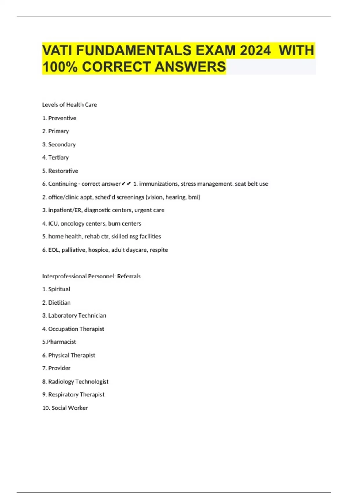 VATI FUNDAMENTALS EXAM 2024 WITH 100% CORRECT ANSWERS Levels of Health Care 1. Preventive 2. Primary 3. Secondary 4. Tertiary 5. Restorative 6. Continuing - correct answer 1. immunizations, stress management, seat belt use 2. office/clinic appt, sched'd screenings (vision, hearing, bmi) 3. inpatient/ER, diagnostic centers, urgent care 4. ICU,