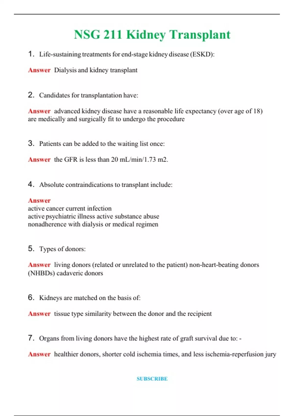NSG 211 Kidney Transplant (Latest 2024 / 2025) Questions & Answers with rationales