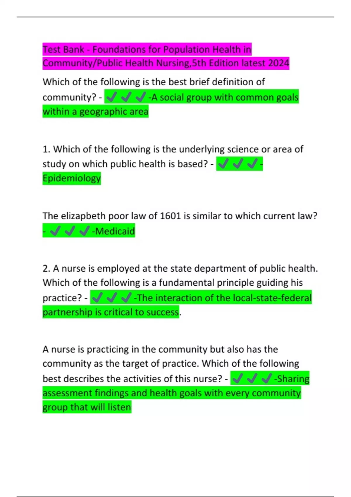 Test Bank - Foundations for Population Health in Community/Public Health Nursing,5th Edition latest 2024