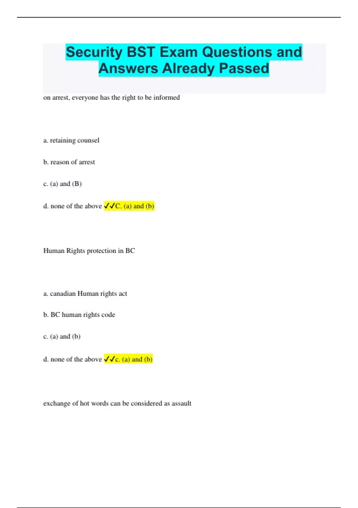 Security BST Exam Questions and Answers Already Passed on arrest, everyone has the right to be informed a. retaining counsel b. reason of arrest c. (a) and (B) d. none of the above C. (a) and (b) Human Rights protection in BC a. canadian Human rights act b. BC human rights code c. (a) and (b) d. none of the above c. (a) and (b) exchange of hot words can be considered as assault a. true b. false b. false An SP must not describe or identify their services by using the words detective, law enforcement, peace officer or police a. true b. false a. true a set of facts is called reasonable ground a. true b. false a. true causing death or grievous bodily harm is called deadly force a. true b. false a. true a witness who gave a written or oral statement that is recorded in the notebook, is having access to the notebook. a. true b. false a. true racial profiling is considered discrimination a. true b. false a. true the way police conducts themselves is called: a. stereotype b. bias