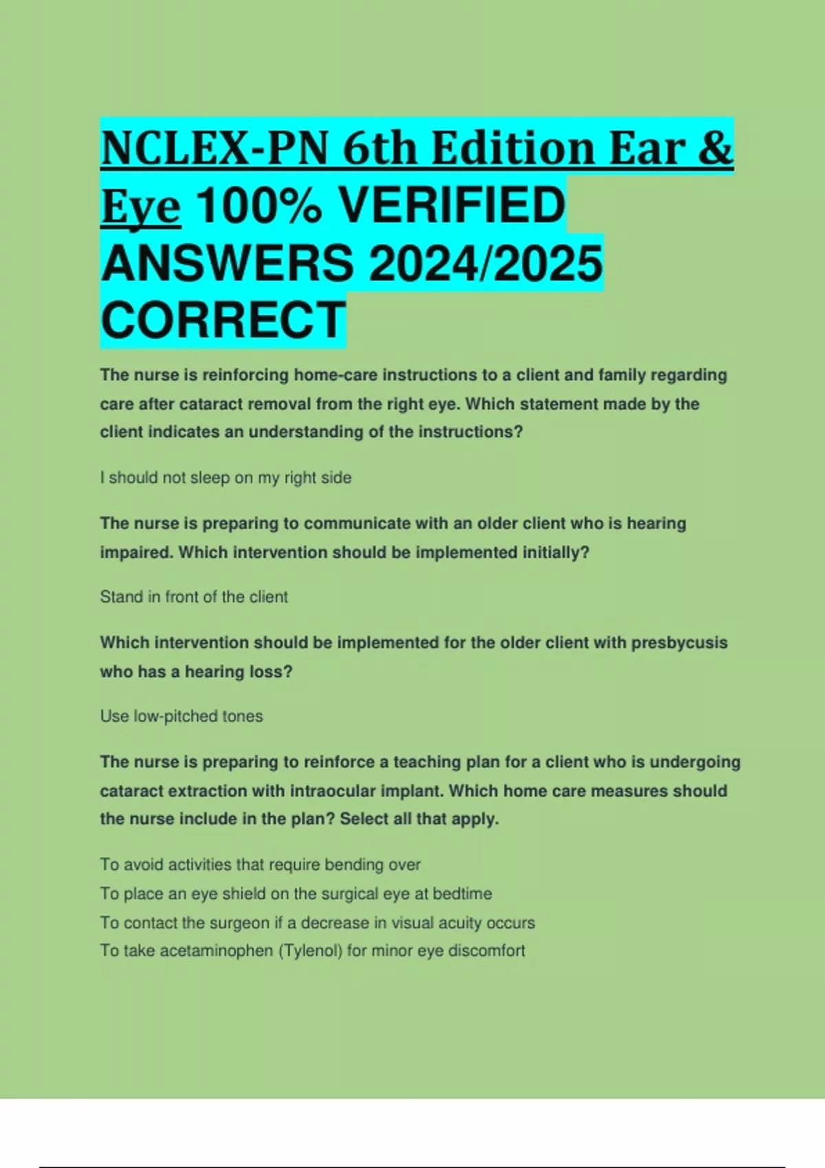 NCLEX-PN 6th Edition Ear & Eye 100% VERIFIED ANSWERS 2024/2025 CORRECT RATED A+++