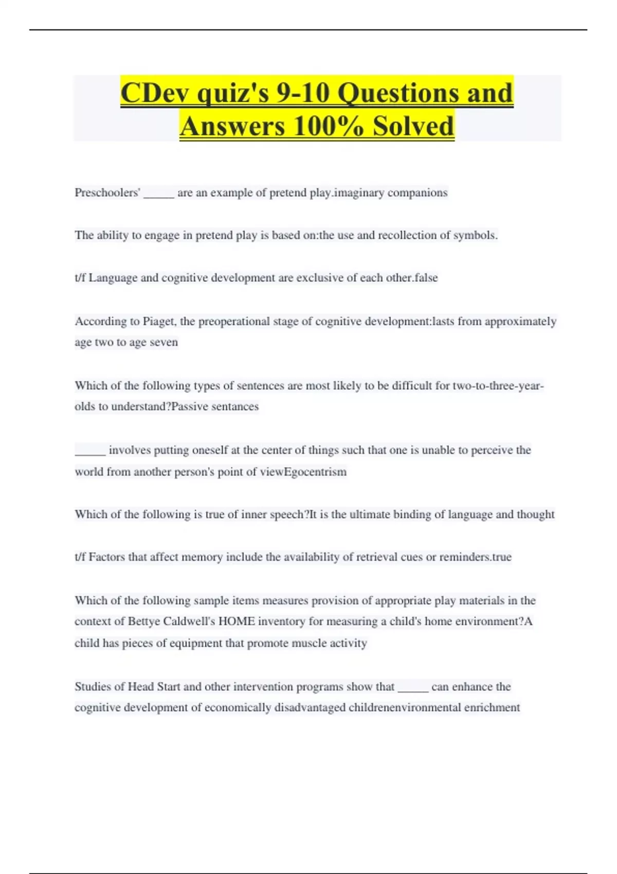 CDev quiz's 9-10 Questions and Answers 100% Solved Preschoolers' _____ are an example of pretend nary companions The ability to engage in pretend play is based on:the use and recollection of symbols. t/f Language and cognitive development are exclusive of each According to Piaget, the preoperational stage of cognitive development:lasts from approximately age two to age seven Which of the following types of sentences are most likely to be difficult for two-to-three-yearolds to understand?Passive sentances _____ involves putting oneself at the center of things such that one is unable to perceive the world from another person's point of viewEgocentrism Which of the following is true of inner speech?It is the ultimate binding of language and thought t/f Factors that affect memory include the availability of retrieval cues or Which of the following sample items measures provision of appropriate play materials in the context of Bettye Caldwell's HOME inventory for measuring a child's home environment?A child has pieces of equipment that promote muscle activity