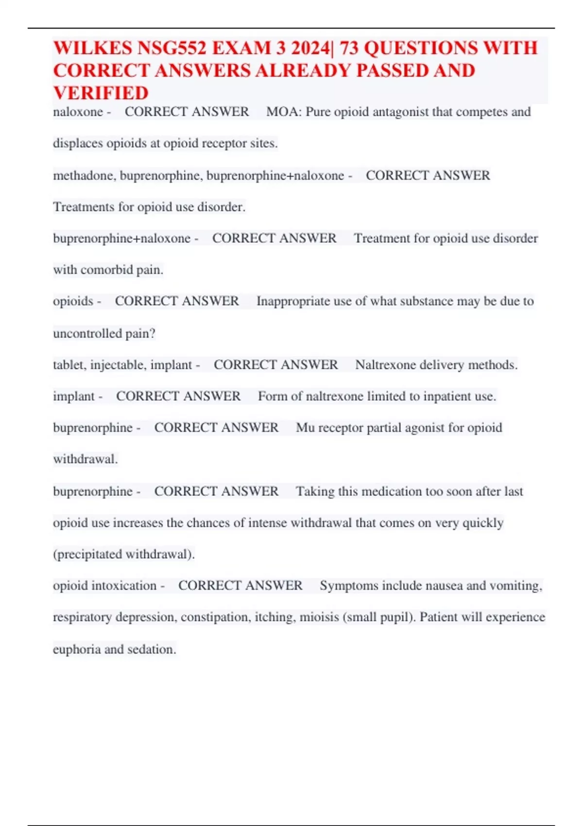 WILKES NSG552 EXAM 3 2024| 73 QUESTIONS WITH CORRECT ANSWERS ALREADY PASSED AND VERIFIED naloxone - CORRECT ANSWER MOA: Pure opioid antagonist that competes and displaces opioids at opioid receptor sites. methadone, buprenorphine, buprenorphine+naloxone - CORRECT ANSWER Treatments for opioid use disorder. buprenorphine+naloxone - CORRECT ANSWER Treatment for opioid use disorder with comorbid pain. opioids - CORRECT ANSWER Inappropriate use of what substance may be due to uncontrolled pain? tablet, injectable, implant - CORRECT ANSWER Naltrexone delivery methods. implant - CORRECT ANSWER Form of naltrexone limited to inpatient use. buprenorphine - CORRECT ANSWER Mu receptor partial agonist for opioid withdrawal. buprenorphine - CORRECT ANSWER Taking this medication too soon after last opioid use increases the chances of intense withdrawal that comes on very quickly (precipitated withdrawal). opioid intoxication - CORRECT ANSWER Symptoms include nausea and vomiting, respiratory depression, constipation, itching, mioisis (small pupil). Patient will experience euphoria and sedation