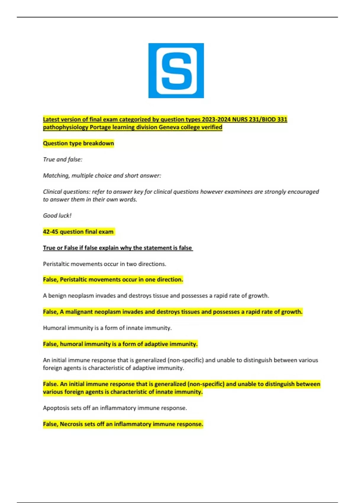 Latest version of final exam categorized by question types 2023-2024 NURS 231/BIOD 331