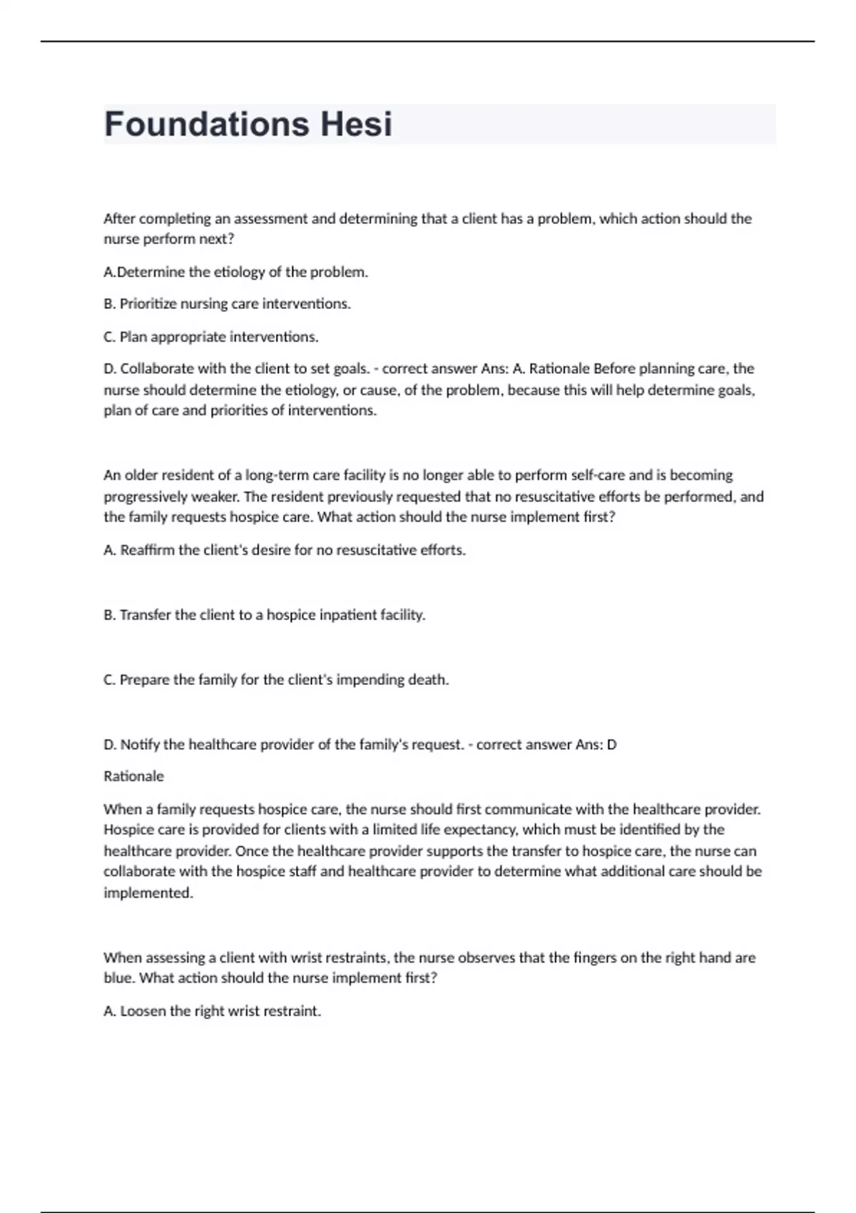 Foundations Hesi HESI Nursing Nightingale College - Questions with complete solution 2024 Foundations Hesi After completing an assessment and determining that a client has a problem, which action should the nurse perform next? A.Determine the etiology of the problem. B. Prioritize nursing care interventions. C. Plan appropriate interventions. D. Collaborate with the client to set goals. - correct answer Ans: A. Rationale Before planning care, the nurse should determine the etiology, or cause, of the problem, because this will help determine goals, plan of care and priorities of interventions. An older resident of a long-term care facility is no longer able to perform self-care and is becoming progressively weaker. The resident previously requested that no resuscitative efforts be performed, and the family requests hospice care. What action should the nurse implement first? A. Reaffirm the client's desire for no resuscitative efforts. B. Transfer the client to a hospice inpatient facility.