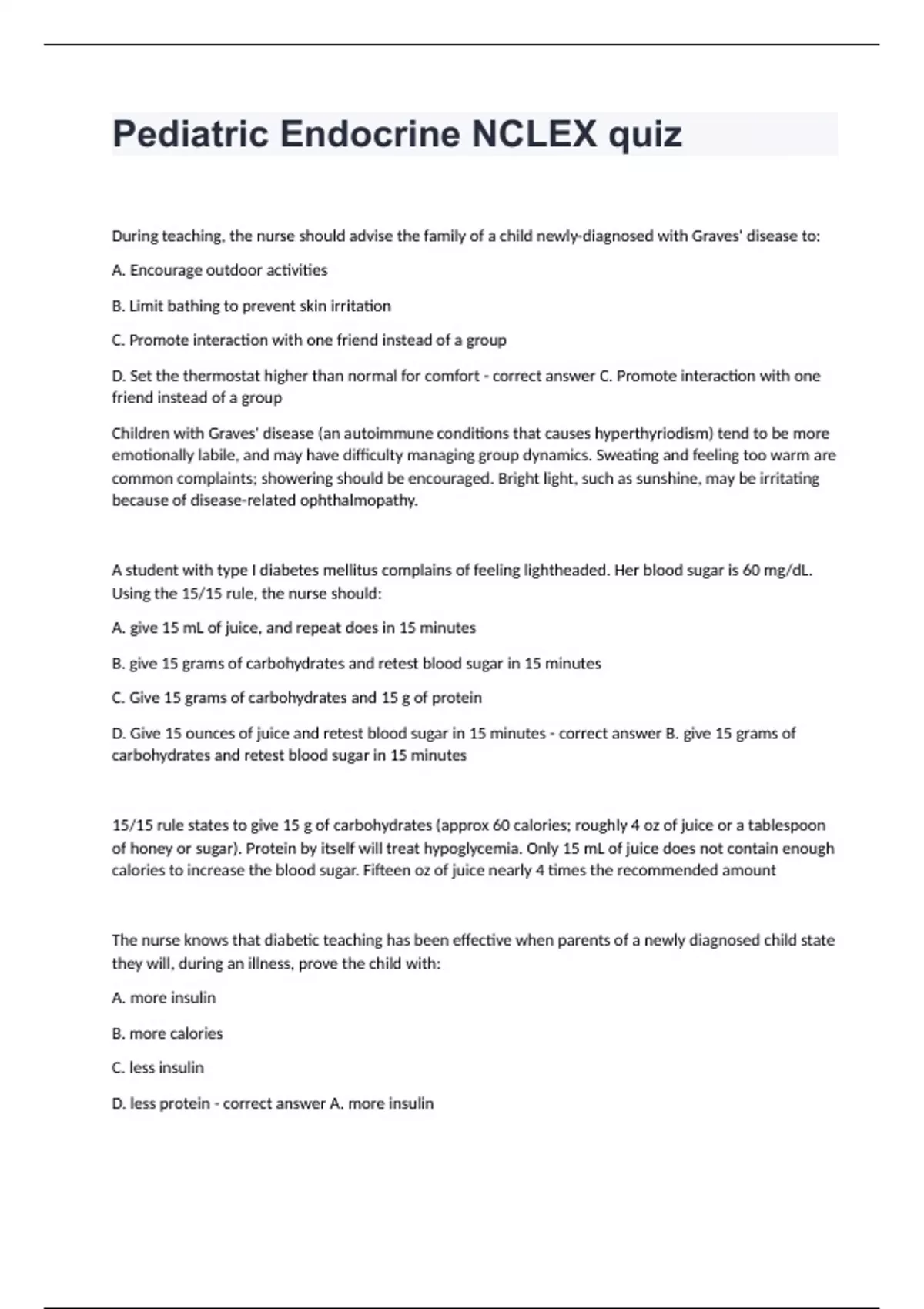 Pediatric Endocrine NCLEX quizDuring teaching, the nurse should advise the family of a child newly-diagnosed with Graves' disease to: A. Encourage outdoor activities B. Limit bathing to prevent skin irritation C. Promote interaction with one friend instead of a group D. Set the thermostat higher than normal for comfort - correct answer C. Promote interaction with one friend instead of a group Children with Graves' disease (an autoimmune conditions that causes hyperthyriodism) tend to be more emotionally labile, and may have difficulty managing group dynamics. Sweating and feeling too warm are common complaints; showering should be encouraged. Bright light, such as sunshine, may be irritating because of disease-related ophthalmopathy. A student with type I diabetes mellitus complains of feeling lightheaded. Her blood sugar is 60 mg/dL. Using the 15/15 rule, the nurse should: A. give 15 mL of juice, and repeat does in 15 minutes B. give 15 grams of carbohydrates and retest blood sugar in 15 minutes C. Give 15 grams of carbohydrates and 15 g of protein D. Give 15 ounces of juice and retest blood sugar in 15 minutes - correct answer B. give 15 grams of carbohydrates and retest blood sugar in 15 minutes 15/15 rule states to give 15 g of carbohydrates (approx 60 calories; roughly 4 oz of juice or a tablespoon of honey or sugar). Protein by itself will treat hypoglycemia. Only 15 mL of juice does not contain enough calories to increase the blood sugar. Fifteen oz of juice nearly 4 times the recommended amount The nurse knows that diabetic teaching has been effective when parents of a newly diagnosed child state they will, during an illness, prove the child with: A. more insulin B. more calories C. less insulin D. less protein - correct answer A. more insulin