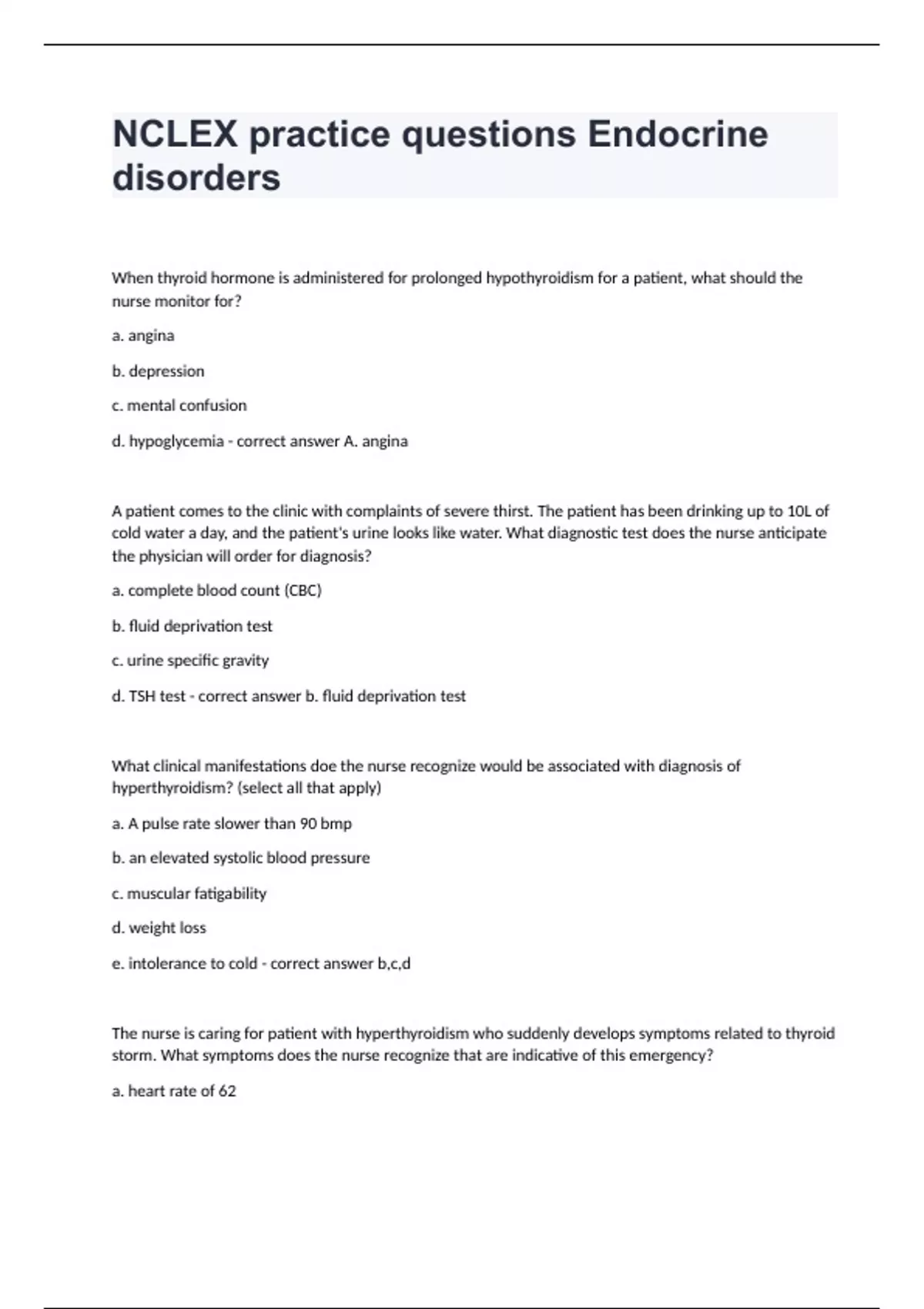 NCLEX practice questions Endocrine disordersWhen thyroid hormone is administered for prolonged hypothyroidism for a patient, what should the nurse monitor for? a. angina b. depression c. mental confusion d. hypoglycemia - correct answer A. angina A patient comes to the clinic with complaints of severe thirst. The patient has been drinking up to 10L of cold water a day, and the patient's urine looks like water. What diagnostic test does the nurse anticipate the physician will order for diagnosis? a. complete blood count (CBC) b. fluid deprivation test c. urine specific gravity d. TSH test - correct answer b. fluid deprivation test What clinical manifestations doe the nurse recognize would be associated with diagnosis of hyperthyroidism? (select all that apply) a. A pulse rate slower than 90 bmp b. an elevated systolic blood pressure c. muscular fatigability d. weight loss e. intolerance to cold - correct answer b,c,d The nurse is caring for patient with hyperthyroidism who suddenly develops symptoms related to thyroid storm. What symptoms does the nurse recognize that are indicative of this emergency? a. heart rate of 62 b. blood pressure 90/58 mmHg c. Oxygenation saturation of 96% d. temperature of 102 F - correct answer d What pharmacologic therapy does the nurse anticipate administering when the patient is experiencing thyroid storm? (select all that apply) a. acetaminophen b. iodine c. propylthiouracil d. synthetic levothyroxine e. dexamethasone (Decadron) - correct answer a, b, c The nurse assess a patient who has an obvious goiter. What type of deficiency does the nurse recognize this is most likely the cause of this? a. thyrotropin b. iodine c. thyroxine d. calcitonin - correct answer b. iodine What breakfast items would the nurse recommend when assisting with the breakfast menu for a patient with hyperthyroidism? a. cereal with milk and bananas b. fried eggs and bacon c. orange juice and toast d. pork sausage and cranberry juice - correct answer d. pork sausage and cranberry juice A patient is suspected of having a pheochromocytoma and is having diagnostic tests done in the hospital. What symptoms does the nurse recognize as most significant for a patient with this disorder? a. blood pressure varying between 120/86 and 240/130 mmHg b. heart rate of 56-64 bmp