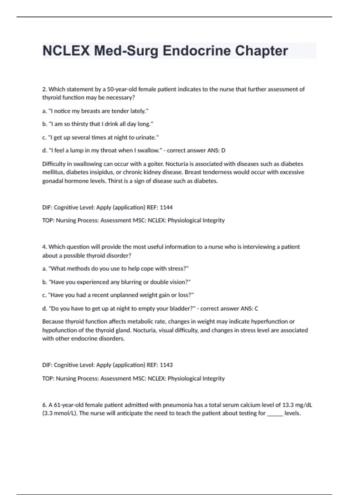 NCLEX Med-Surg Endocrine Chapter2. Which statement by a 50-year-old female patient indicates to the nurse that further assessment of thyroid function may be necessary? a. "I notice my breasts are tender lately." b. "I am so thirsty that I drink all day long." c. "I get up several times at night to urinate." d. "I feel a lump in my throat when I swallow." - correct answer ANS: D Difficulty in swallowing can occur with a goiter. Nocturia is associated with diseases such as diabetes mellitus, diabetes insipidus, or chronic kidney disease. Breast tenderness would occur with excessive gonadal hormone levels. Thirst is a sign of disease such as diabetes. DIF: Cognitive Level: Apply (application) REF: 1144 TOP: Nursing Process: Assessment MSC: NCLEX: Physiological Integrity 4. Which question will provide the most useful information to a nurse who is interviewing a patient about a possible thyroid disorder? a. "What methods do you use to help cope with stress?" b. "Have you experienced any blurring or double vision?" c. "Have you had a recent unplanned weight gain or loss?" d. "Do you have to get up at night to empty your bladder?" - correct answer ANS: C Because thyroid function affects metabolic rate, changes in weight may indicate hyperfunction or hypofunction of the thyroid gland. Nocturia, visual difficulty, and changes in stress level are associated with other endocrine disorders. DIF: Cognitive Level: Apply (application) REF: 1143 TOP: Nursing Process: Assessment MSC: NCLEX: Physiological Integrity 6. A 61-year-old female patient admitted with pneumonia has a total serum calcium level of 13.3 mg/dL (3.3 mmol/L). The nurse will anticipate the need to teach the patient about testing for _____ levels.