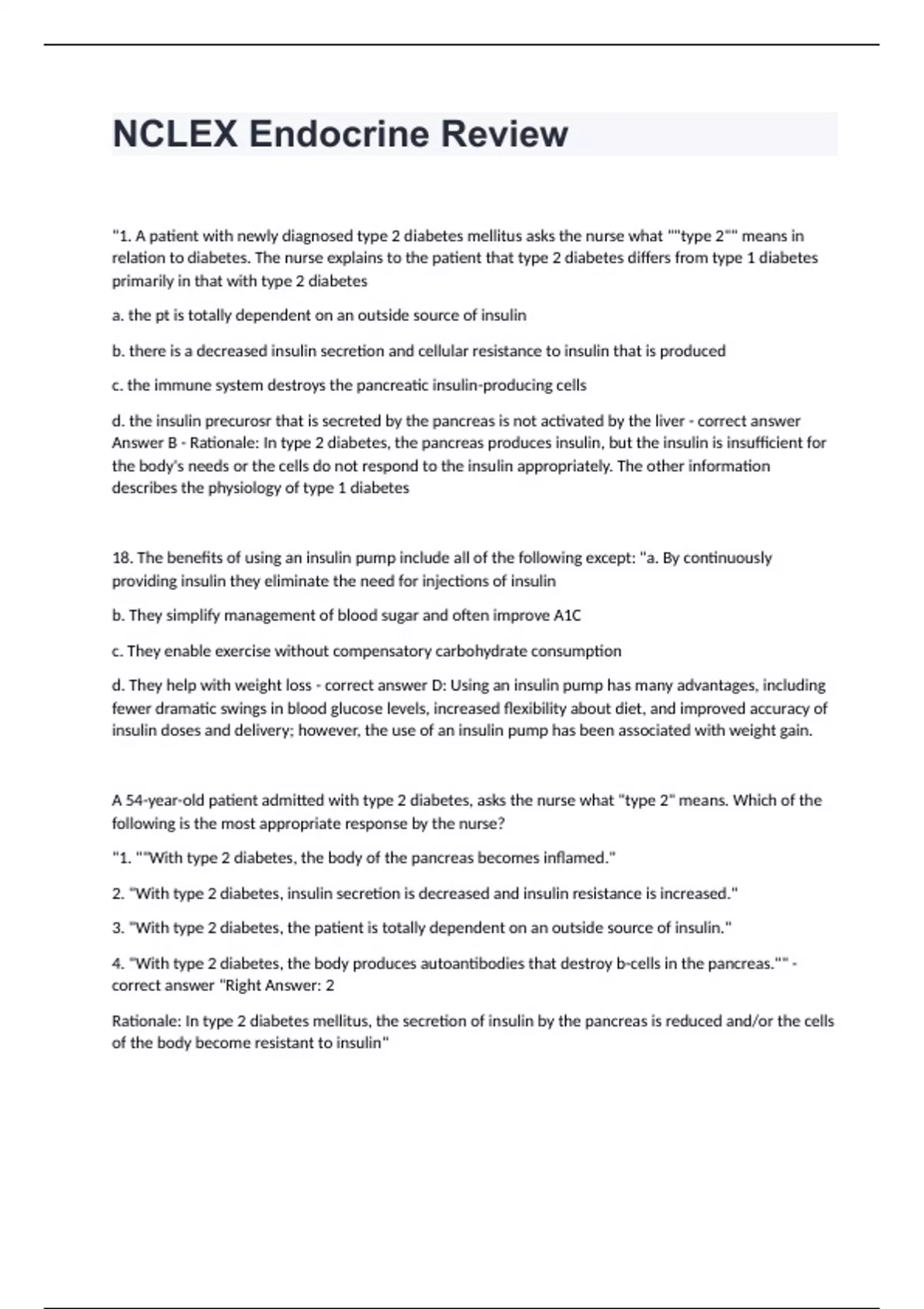 NCLEX Endocrine Review "1. A patient with newly diagnosed type 2 diabetes mellitus asks the nurse what ""type 2"" means in relation to diabetes. The nurse explains to the patient that type 2 diabetes differs from type 1 diabetes primarily in that with type 2 diabetes a. the pt is totally dependent on an outside source of insulin b. there is a decreased insulin secretion and cellular resistance to insulin that is produced c. the immune system destroys the pancreatic insulin-producing cells d. the insulin precurosr that is secreted by the pancreas is not activated by the liver - correct answer Answer B - Rationale: In type 2 diabetes, the pancreas produces insulin, but the insulin is insufficient for the body's needs or the cells do not respond to the insulin appropriately. The other information describes the physiology of type 1 diabetes 18. The benefits of using an insulin pump include all of the following except: "a. By continuously providing insulin they eliminate the need for injections of insulin b. They simplify management of blood sugar and often improve A1C c. They enable exercise without compensatory carbohydrate consumption d. They help with weight loss - correct answer D: Using an insulin pump has many advantages, including fewer dramatic swings in blood glucose levels, increased flexibility about diet, and improved accuracy of insulin doses and delivery; however, the use of an insulin pump has been associated with weight gain. A 54-year-old patient admitted with type 2 diabetes, asks the nurse what "type 2" means. Which of the following is the most appropriate response by the nurse? "1. ""With type 2 diabetes, the body of the pancreas becomes inflamed." 2. "With type 2 diabetes, insulin secretion is decreased and insulin resistance is increased." 3. "With type 2 diabetes, the patient is totally dependent on an outside source of insulin." 4. "With type 2 diabetes, the body produces autoantibodies that destroy b-cells in the pancreas."" - correct answer "Right Answer: 2 Rationale: In type 2 diabetes mellitus, the secretion of insulin by the pancreas is reduced and/or the cells of the body become resistant to insulin"
