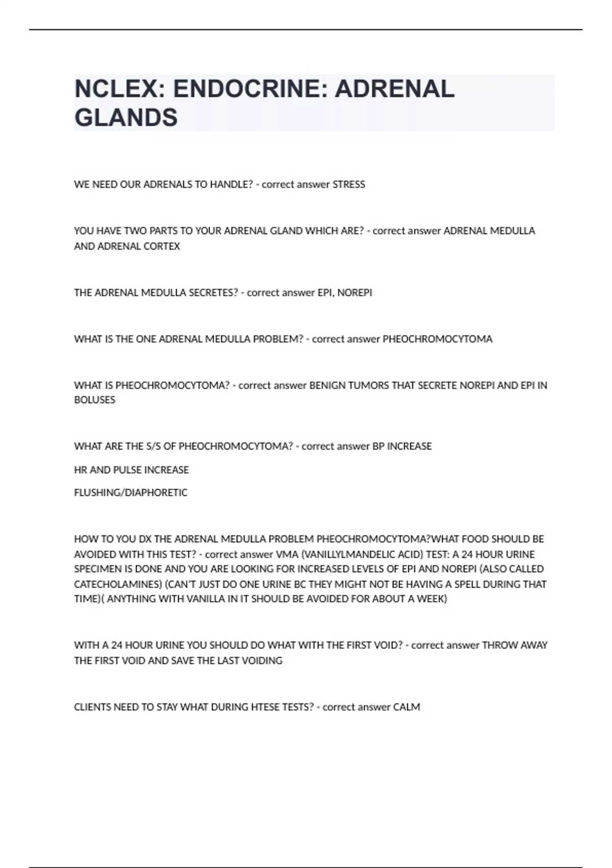 NCLEX: ENDOCRINE: ADRENAL GLANDSWE NEED OUR ADRENALS TO HANDLE? - correct answer STRESS YOU HAVE TWO PARTS TO YOUR ADRENAL GLAND WHICH ARE? - correct answer ADRENAL MEDULLA AND ADRENAL CORTEX THE ADRENAL MEDULLA SECRETES? - correct answer EPI, NOREPI WHAT IS THE ONE ADRENAL MEDULLA PROBLEM? - correct answer PHEOCHROMOCYTOMA WHAT IS PHEOCHROMOCYTOMA? - correct answer BENIGN TUMORS THAT SECRETE NOREPI AND EPI IN BOLUSES WHAT ARE THE S/S OF PHEOCHROMOCYTOMA? - correct answer BP INCREASE HR AND PULSE INCREASE FLUSHING/DIAPHORETIC HOW TO YOU DX THE ADRENAL MEDULLA PROBLEM PHEOCHROMOCYTOMA?WHAT FOOD SHOULD BE AVOIDED WITH THIS TEST? - correct answer VMA (VANILLYLMANDELIC ACID) TEST: A 24 HOUR URINE SPECIMEN IS DONE AND YOU ARE LOOKING FOR INCREASED LEVELS OF EPI AND NOREPI (ALSO CALLED CATECHOLAMINES) (CAN'T JUST DO ONE URINE BC THEY MIGHT NOT BE HAVING A SPELL DURING THAT TIME)( ANYTHING WITH VANILLA IN IT SHOULD BE AVOIDED FOR ABOUT A WEEK) WITH A 24 HOUR URINE YOU SHOULD DO WHAT WITH THE FIRST VOID? - correct answer THROW AWAY THE FIRST VOID AND SAVE THE LAST VOIDING CLIENTS NEED TO STAY WHAT DURING HTESE TESTS? - correct answer CALM