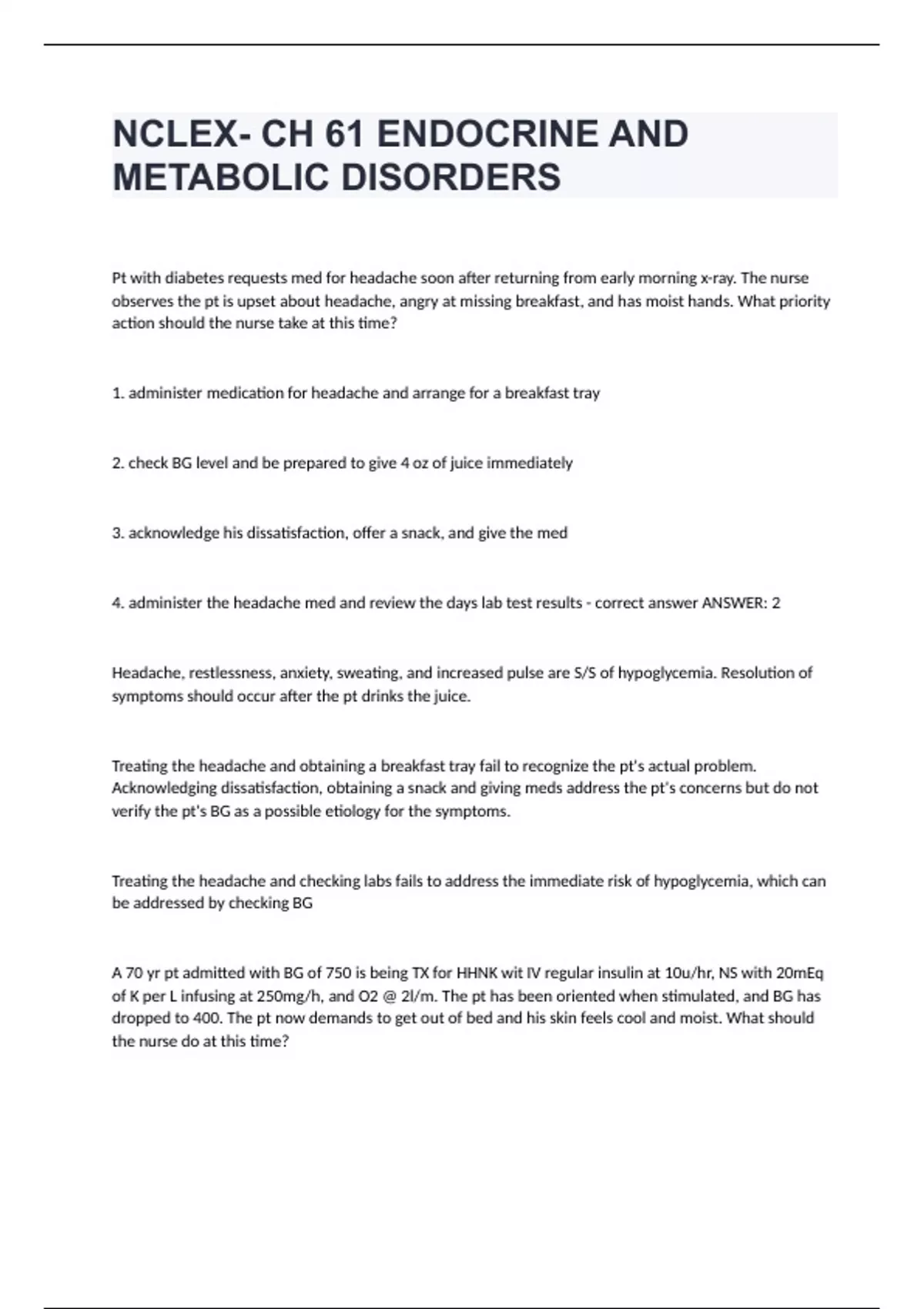NCLEX- CH 61 ENDOCRINE AND METABOLIC DISORDERSPt with diabetes requests med for headache soon after returning from early morning x-ray. The nurse observes the pt is upset about headache, angry at missing breakfast, and has moist hands. What priority action should the nurse take at this time? 1. administer medication for headache and arrange for a breakfast tray 2. check BG level and be prepared to give 4 oz of juice immediately 3. acknowledge his dissatisfaction, offer a snack, and give the med 4. administer the headache med and review the days lab test results - correct answer ANSWER: 2 Headache, restlessness, anxiety, sweating, and increased pulse are S/S of hypoglycemia. Resolution of symptoms should occur after the pt drinks the juice. Treating the headache and obtaining a breakfast tray fail to recognize the pt's actual problem. Acknowledging dissatisfaction, obtaining a snack and giving meds address the pt's concerns but do not verify the pt's BG as a possible etiology for the symptoms. Treating the headache and checking labs fails to address the immediate risk of hypoglycemia, which can be addressed by checking BG A 70 yr pt admitted with BG of 750 is being TX for HHNK wit IV regular insulin at 10u/hr, NS with 20mEq of K per L infusing at 250mg/h, and O2 @ 2l/m. The pt has been oriented when stimulated, and BG has dropped to 400. The pt now demands to get out of bed and his skin feels cool and moist. What should the nurse do at this time?
