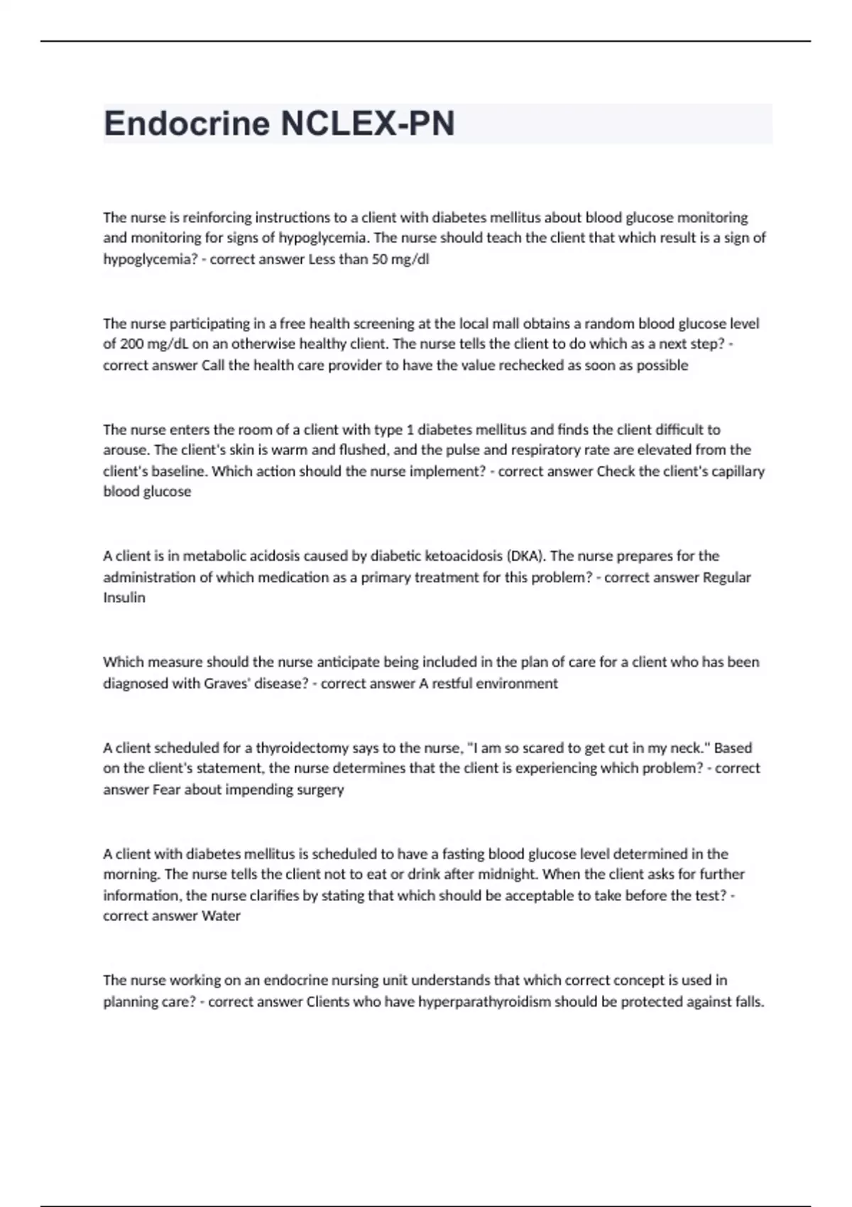 Endocrine NCLEX-PNThe nurse is reinforcing instructions to a client with diabetes mellitus about blood glucose monitoring and monitoring for signs of hypoglycemia. The nurse should teach the client that which result is a sign of hypoglycemia? - correct answer Less than 50 mg/dl The nurse participating in a free health screening at the local mall obtains a random blood glucose level of 200 mg/dL on an otherwise healthy client. The nurse tells the client to do which as a next step? - correct answer Call the health care provider to have the value rechecked as soon as possible The nurse enters the room of a client with type 1 diabetes mellitus and finds the client difficult to arouse. The client's skin is warm and flushed, and the pulse and respiratory rate are elevated from the client's baseline. Which action should the nurse implement? - correct answer Check the client's capillary blood glucose A client is in metabolic acidosis caused by diabetic ketoacidosis (DKA). The nurse prepares for the administration of which medication as a primary treatment for this problem? - correct answer Regular Insulin Which measure should the nurse anticipate being included in the plan of care for a client who has been diagnosed with Graves' disease? - correct answer A restful environment A client scheduled for a thyroidectomy says to the nurse, "I am so scared to get cut in my neck." Based on the client's statement, the nurse determines that the client is experiencing which problem? - correct answer Fear about impending surgery A client with diabetes mellitus is scheduled to have a fasting blood glucose level determined in the morning. The nurse tells the client not to eat or drink after midnight. When the client asks for further information, the nurse clarifies by stating that which should be acceptable to take before the test? - correct answer Water The nurse working on an endocrine nursing unit understands that which correct concept is used in planning care? - correct answer Clients who have hyperparathyroidism should be protected against falls.