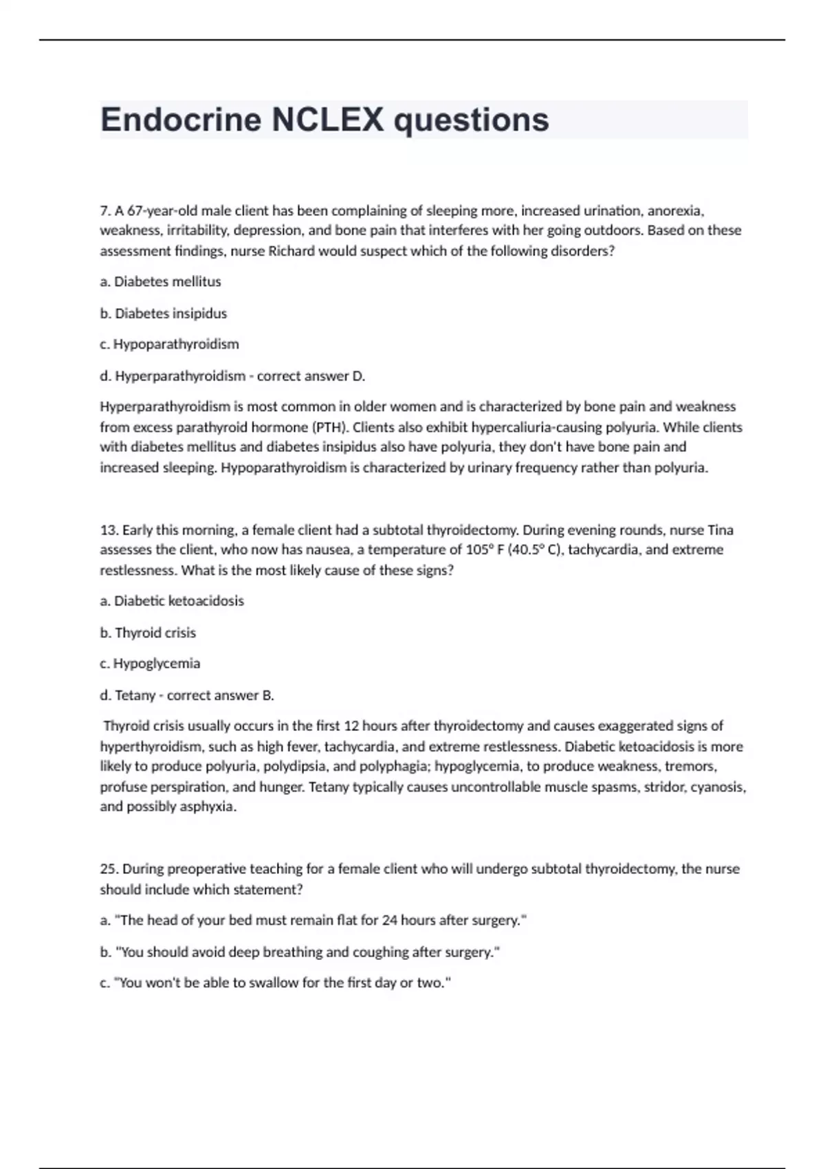 Endocrine NCLEX questions7. A 67-year-old male client has been complaining of sleeping more, increased urination, anorexia, weakness, irritability, depression, and bone pain that interferes with her going outdoors. Based on these assessment findings, nurse Richard would suspect which of the following disorders? a. Diabetes mellitus b. Diabetes insipidus c. Hypoparathyroidism d. Hyperparathyroidism - correct answer D. Hyperparathyroidism is most common in older women and is characterized by bone pain and weakness from excess parathyroid hormone (PTH). Clients also exhibit hypercaliuria-causing polyuria. While clients with diabetes mellitus and diabetes insipidus also have polyuria, they don't have bone pain and increased sleeping. Hypoparathyroidism is characterized by urinary frequency rather than polyuria. 13. Early this morning, a female client had a subtotal thyroidectomy. During evening rounds, nurse Tina assesses the client, who now has nausea, a temperature of 105° F (40.5° C), tachycardia, and extreme restlessness. What is the most likely cause of these signs? a. Diabetic ketoacidosis b. Thyroid crisis c. Hypoglycemia d. Tetany - correct answer B. Thyroid crisis usually occurs in the first 12 hours after thyroidectomy and causes exaggerated signs of hyperthyroidism, such as high fever, tachycardia, and extreme restlessness. Diabetic ketoacidosis is more likely to produce polyuria, polydipsia, and polyphagia; hypoglycemia, to produce weakness, tremors, profuse perspiration, and hunger. Tetany typically causes uncontrollable muscle spasms, stridor, cyanosis, and possibly asphyxia. 25. During preoperative teaching for a female client who will undergo subtotal thyroidectomy, the nurse should include which statement? a. "The head of your bed must remain flat for 24 hours after surgery." b. "You should avoid deep breathing and coughing after surgery." c. "You won't be able to swallow for the first day or two."