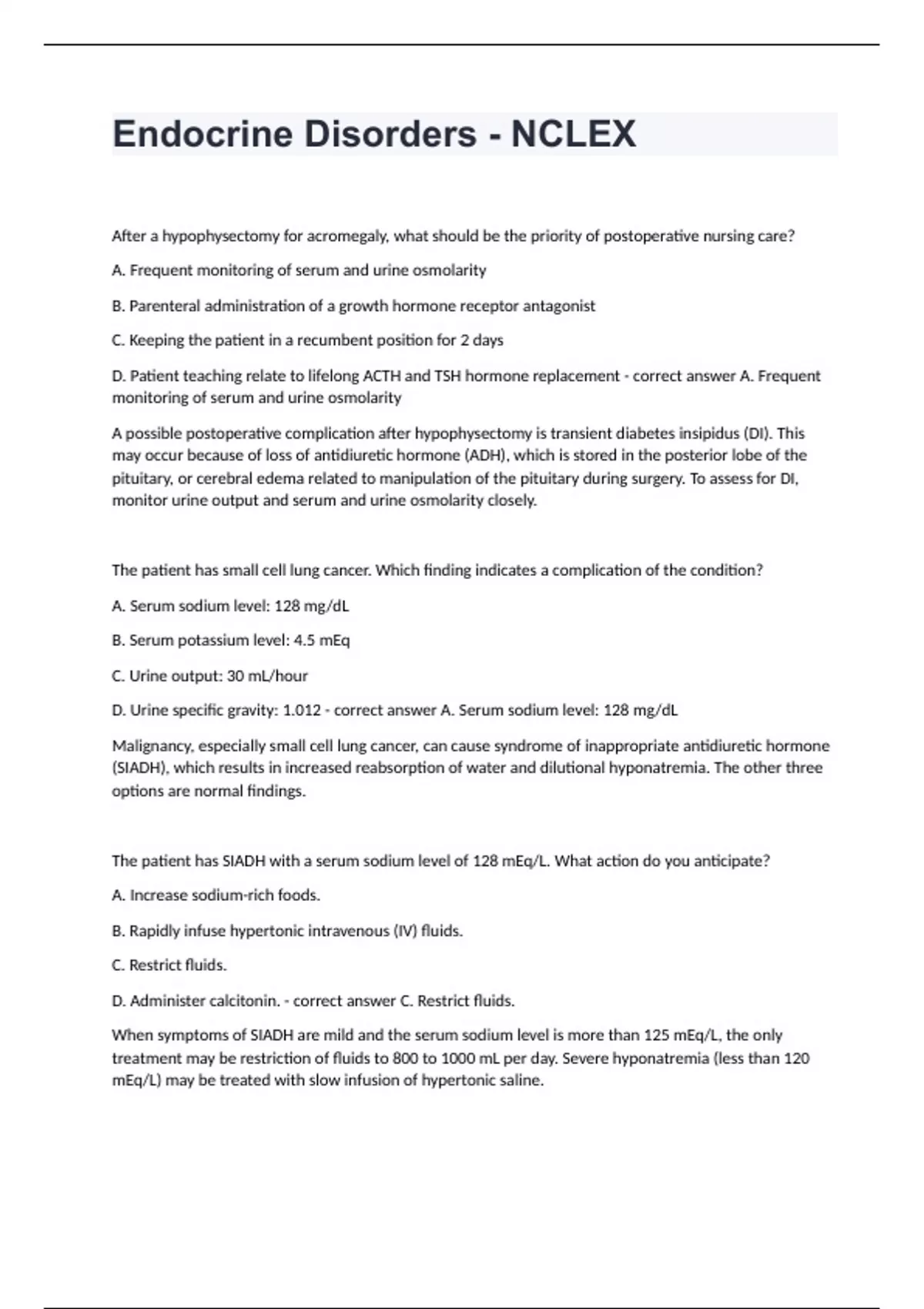 Endocrine Disorders - NCLEXAfter a hypophysectomy for acromegaly, what should be the priority of postoperative nursing care? A. Frequent monitoring of serum and urine osmolarity B. Parenteral administration of a growth hormone receptor antagonist C. Keeping the patient in a recumbent position for 2 days D. Patient teaching relate to lifelong ACTH and TSH hormone replacement - correct answer A. Frequent monitoring of serum and urine osmolarity A possible postoperative complication after hypophysectomy is transient diabetes insipidus (DI). This may occur because of loss of antidiuretic hormone (ADH), which is stored in the posterior lobe of the pituitary, or cerebral edema related to manipulation of the pituitary during surgery. To assess for DI, monitor urine output and serum and urine osmolarity closely. The patient has small cell lung cancer. Which finding indicates a complication of the condition? A. Serum sodium level: 128 mg/dL B. Serum potassium level: 4.5 mEq C. Urine output: 30 mL/hour D. Urine specific gravity: 1.012 - correct answer A. Serum sodium level: 128 mg/dL Malignancy, especially small cell lung cancer, can cause syndrome of inappropriate antidiuretic hormone (SIADH), which results in increased reabsorption of water and dilutional hyponatremia. The other three options are normal findings. The patient has SIADH with a serum sodium level of 128 mEq/L. What action do you anticipate? A. Increase sodium-rich foods. B. Rapidly infuse hypertonic intravenous (IV) fluids. C. Restrict fluids. D. Administer calcitonin. - correct answer C. Restrict fluids. When symptoms of SIADH are mild and the serum sodium level is more than 125 mEq/L, the only treatment may be restriction of fluids to 800 to 1000 mL per day. Severe hyponatremia (less than 120 mEq/L) may be treated with slow infusion of hypertonic saline.
