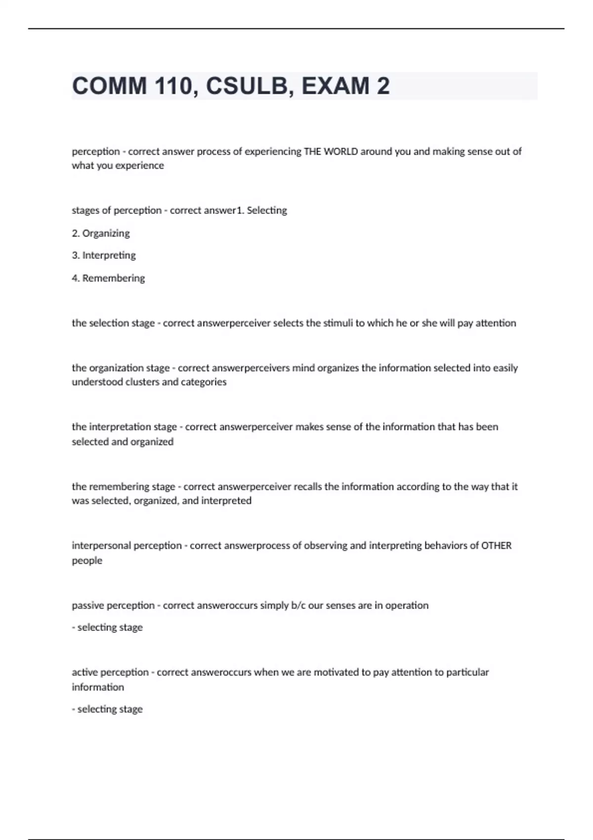 COMM 110, CSULB, EXAM 2 Question and answers already passed 2024 COMM 110, CSULB, EXAM 2 perception - correct answer process of experiencing THE WORLD around you and making sense out of what you experience stages of perception - correct answer1. Selecting 2. Organizing 3. Interpreting 4. Remembering the selection stage - correct answerperceiver selects the stimuli to which he or she will pay attention the organization stage - correct answerperceivers mind organizes the information selected into easily understood clusters and categories the interpretation stage - correct answerperceiver makes sense of the information that has been selected and organized the remembering stage - correct answerperceiver recalls the information according to the way that it was selected, organized, and interpreted interpersonal perception - correct answerprocess of observing and interpreting behaviors of OTHER people passive perception - correct answeroccurs simply b/c our senses are in operation - selecting stage active perception - correct answeroccurs when we are motivated to pay attention to particular information - selecting stage