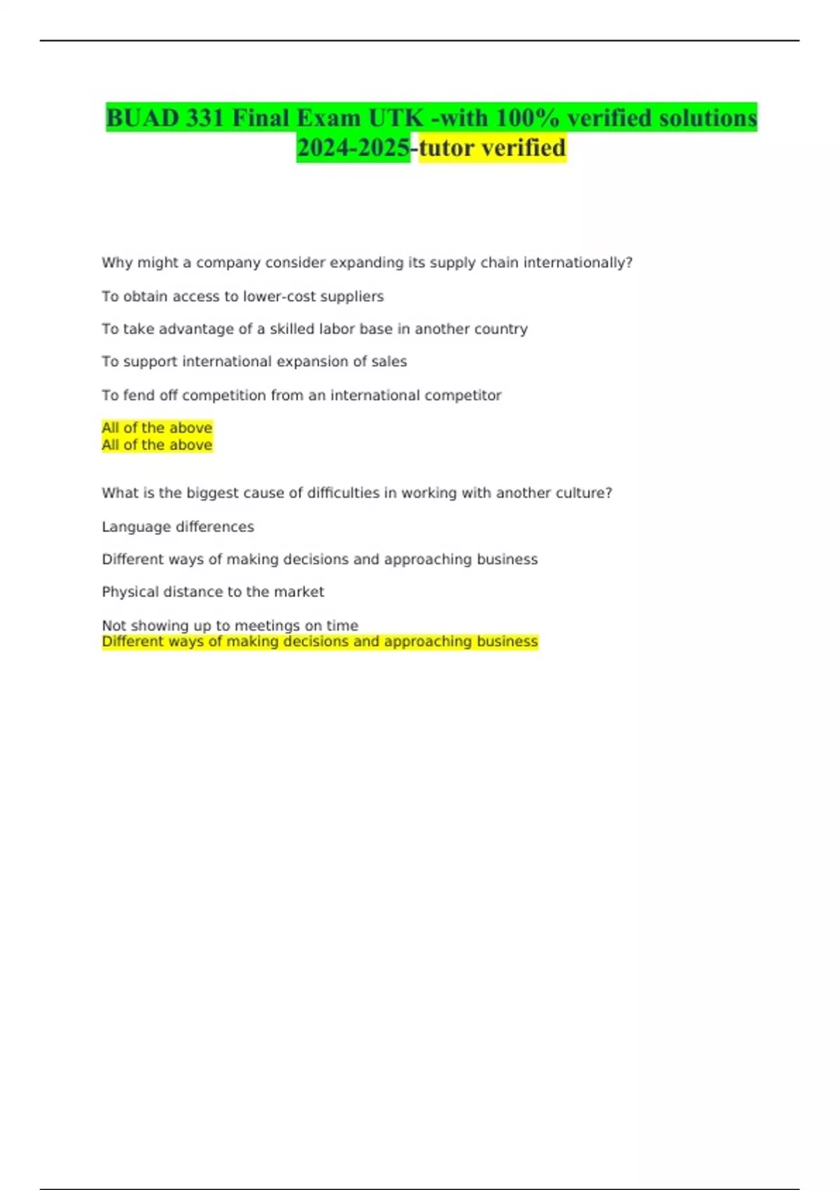BUAD 331 Final Exam UTK -with 100% verified solutions -tutor verified