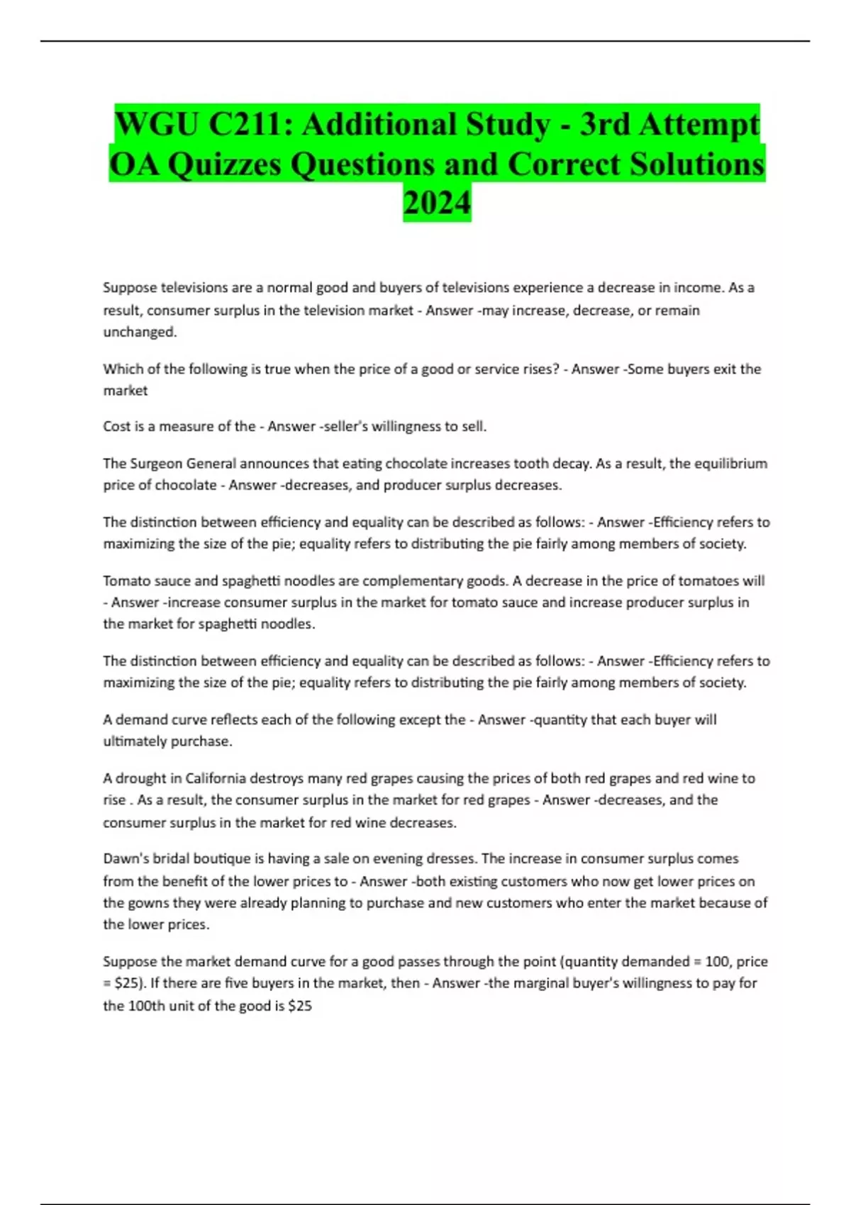 WGU C211: Additional Study - 3rd Attempt OA Quizzes Questions and Correct Solutions 2024 Suppose televisions are a normal good and buyers of televisions experience a decrease in income. As a result, consumer surplus in the television market - Answer -may increase, decrease, or remain unchanged. Which of the following is true when the price of a good or service rises? - Answer -Some buyers exit the market Cost is a measure of the - Answer -seller's willingness to sell. The Surgeon General announces that eating chocolate increases tooth decay. As a result, the equilibrium price of chocolate - Answer -decreases, and producer surplus decreases. The distinction between efficiency and equality can be described as follows: - Answer -Efficiency refers to maximizing the size of the pie; equality refers to distributing the pie fairly among members of society. Tomato sauce and spaghetti noodles are complementary goods. A decrease in the price of tomatoes will - Answer -increase consumer surplus in the market for tomato sauce and increase producer surplus in the market for spaghetti noodles. The distinction between efficiency and equality can be described as follows: - Answer -Efficiency refers to maximizing the size of the pie; equality refers to distributing the pie fairly among members of society. A demand curve reflects each of the following except the - Answer -quantity that each buyer will ultimately purchase. A drought in California destroys many red grapes causing the prices of both red grapes and red wine to rise . As a result, the consumer surplus in the market for red grapes - Answer -decreases, and the consumer surplus in the market for red wine decreases. Dawn's bridal boutique is having a sale on evening dresses. The increase in consumer surplus comes from the benefit of the lower prices to - Answer -both existing customers who now get lower prices on the gowns they were already planning to purchase and new customers who enter the market because of the lower prices. Suppose the market demand curve for a good passes through the point (quantity demanded = 100, price = $25). If there are five buyers in the market, then - Answer -the marginal buyer's willingness to pay for the 100th unit of the good is $25When a country that imports a particular good imposes a tariff on that good, - Answer -consumer surplus decreases and total surplus decreases in the market for that good. Import quotas and tariffs produce some common results. Which of the following is not one of those common results? - Answer -Equal revenue is always raised for the domestic government The world price of a ton of steel is $1,000. Before Russia allowed trade in steel, the price of a ton of steel there was $650. Once Russia allowed trade in steel with other countries, Russia began - Answer - exporting steel and the price per ton in Russ