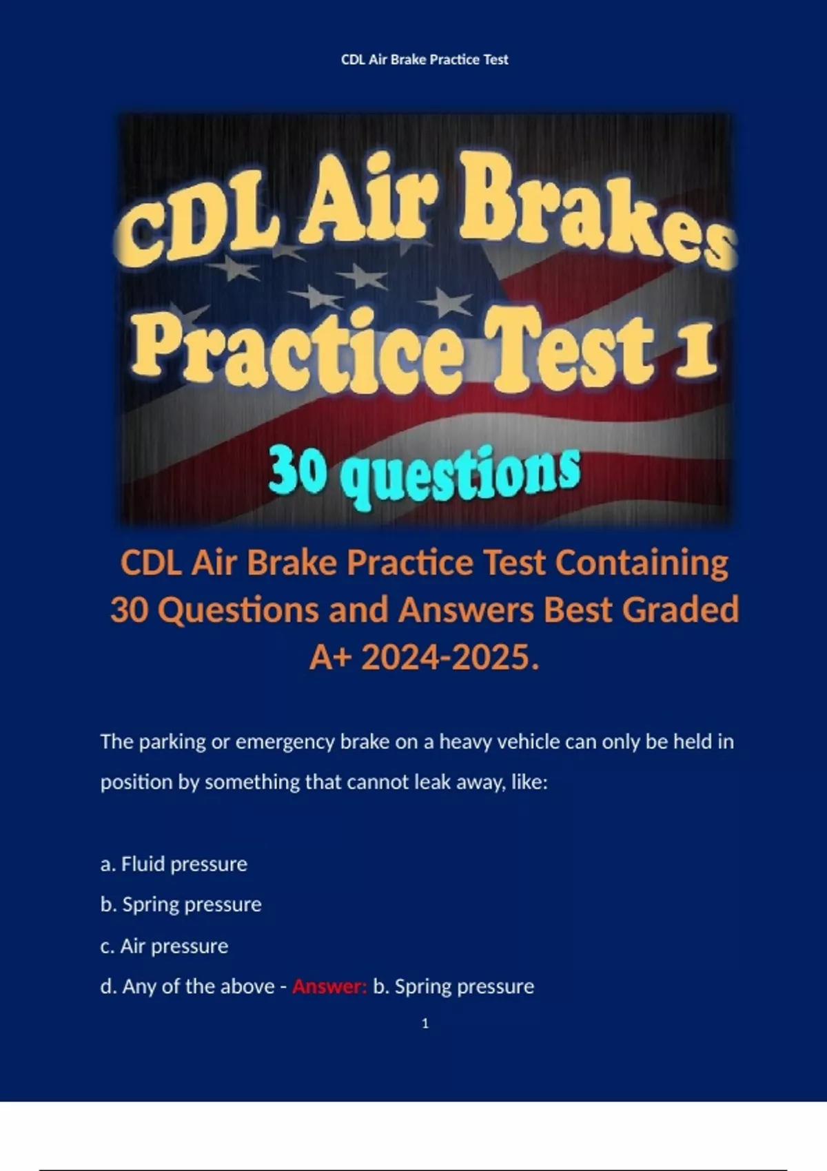 CDL Air Brake Practice Test Containing 30 Questions and Answers Best Graded A+ . Terms like: The parking or emergency brake on a heavy vehicle can only be held in position by something that cannot leak away, like: a. Fluid pressure b. Spring pressure c. Air pressure d. Any of the above - Answer: b. Spring pressure