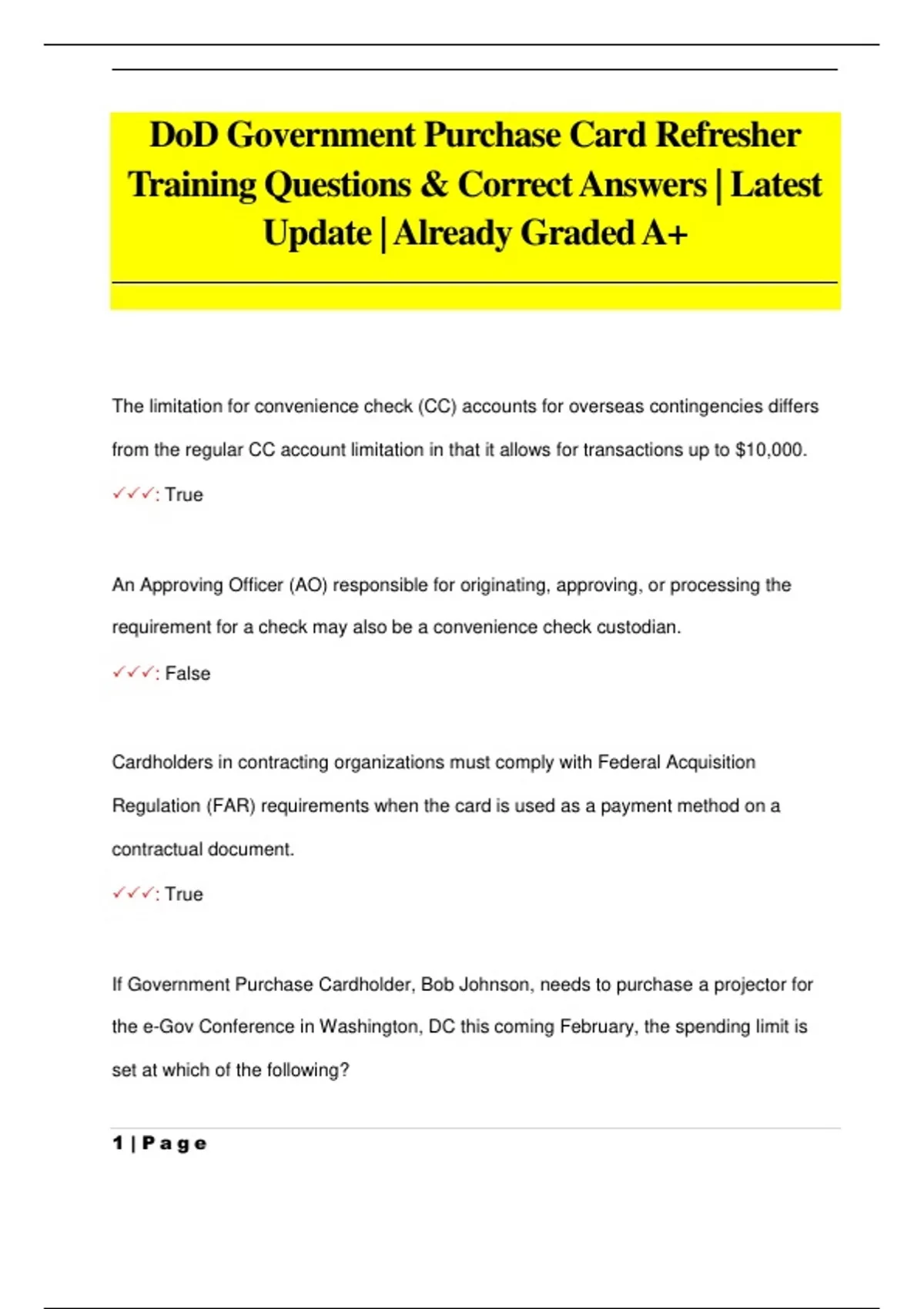 The limitation for convenience check (CC) accounts for overseas contingencies differs from the regular CC account limitation in that it allows for transactions up to $10,000. : True An Approving Officer (AO) responsible for originating, approving, or processing the requirement for a check may also be a convenience check custodian. : False Cardholders in contracting organizations must comply with Federal Acquisition Regulation (FAR) requirements when the card is used as a payment method on a contractual document. : True If Government Purchase Cardholder, Bob Johnson, needs to purchase a projector for the e-Gov Conference in Washington, DC this coming February, the spending limit is set at which of the following? 2 | P a g e : $3,500 For which situation does the $2,000 spending limit apply? : Purchasing construction. If Government Purchase Cardholder, Linda Hamilton, needs to purchase weapon safety training for her team, the spending limit is set at which of the following? : $25,000 The SF 182 is the correct form used for purchasing training while paying with the Government Purchase Card (GPC). : True