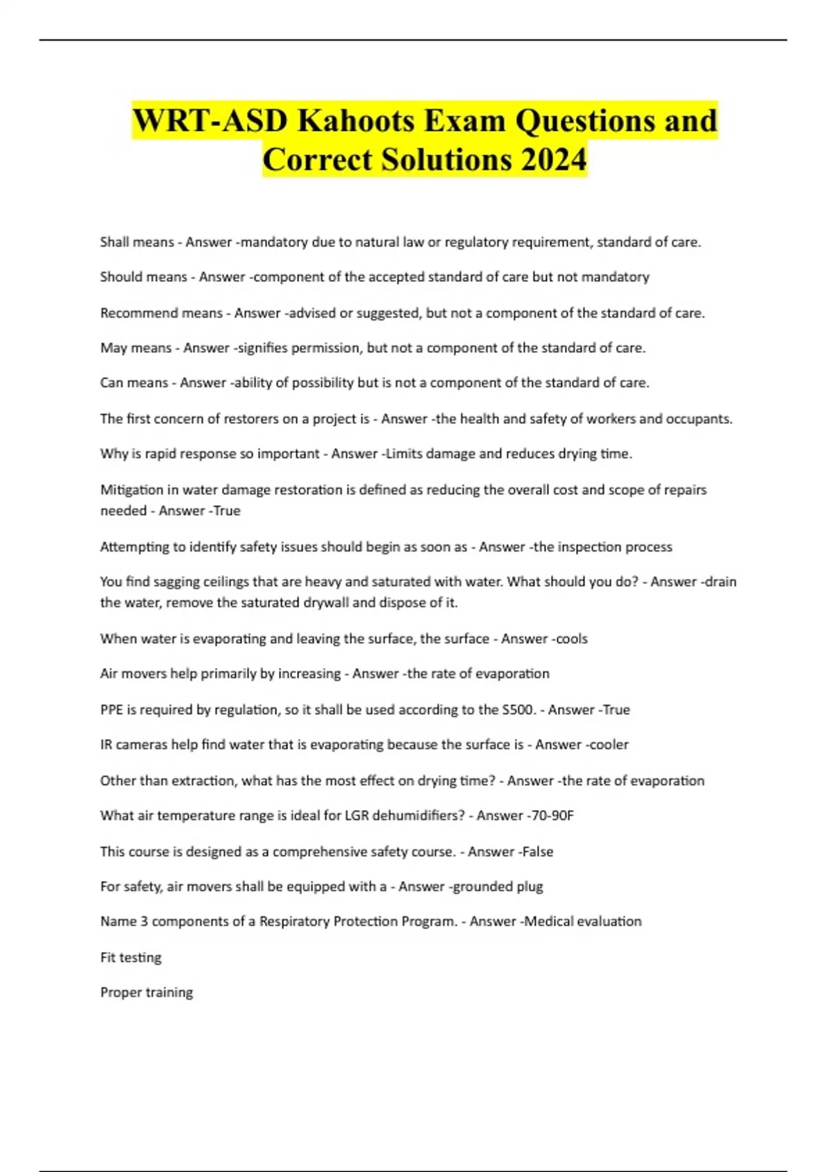WRT-ASD Kahoots Exam Questions and Correct Solutions 2024 Shall means - Answer -mandatory due to natural law or regulatory requirement, standard of care. Should means - Answer -component of the accepted standard of care but not mandatory Recommend means - Answer -advised or suggested, but not a component of the standard of care. May means - Answer -signifies permission, but not a component of the standard of care. Can means - Answer -ability of possibility but is not a component of the standard of care. The first concern of restorers on a project is - Answer -the health and safety of workers and occupants. Why is rapid response so important - Answer -Limits damage and reduces drying time. Mitigation in water damage restoration is defined as reducing the overall cost and scope of repairs needed - Answer -True Attempting to identify safety issues should begin as soon as - Answer -the inspection process You find sagging ceilings that are heavy and saturated with water. What should you do? - Answer -drain the water, remove the saturated drywall and dispose of it. When water is evaporating and leaving the surface, the surface - Answer -cools Air movers help primarily by increasing - Answer -the rate of evaporation PPE is required by regulation, so it shall be used according to the S500. - Answer -True IR cameras help find water that is evaporating because the surface is - Answer -cooler Other than extraction, what has the most effect on drying time? - Answer -the rate of evaporation What air temperature range is ideal for LGR dehumidifiers? - Answer -70-90F This course is designed as a comprehensive safety course. - Answer -False For safety, air movers shall be equipped with a - Answer -grounded plug Name 3 components of a Respiratory Protection Program. - Answer -Medical evaluation Fit testing Proper training