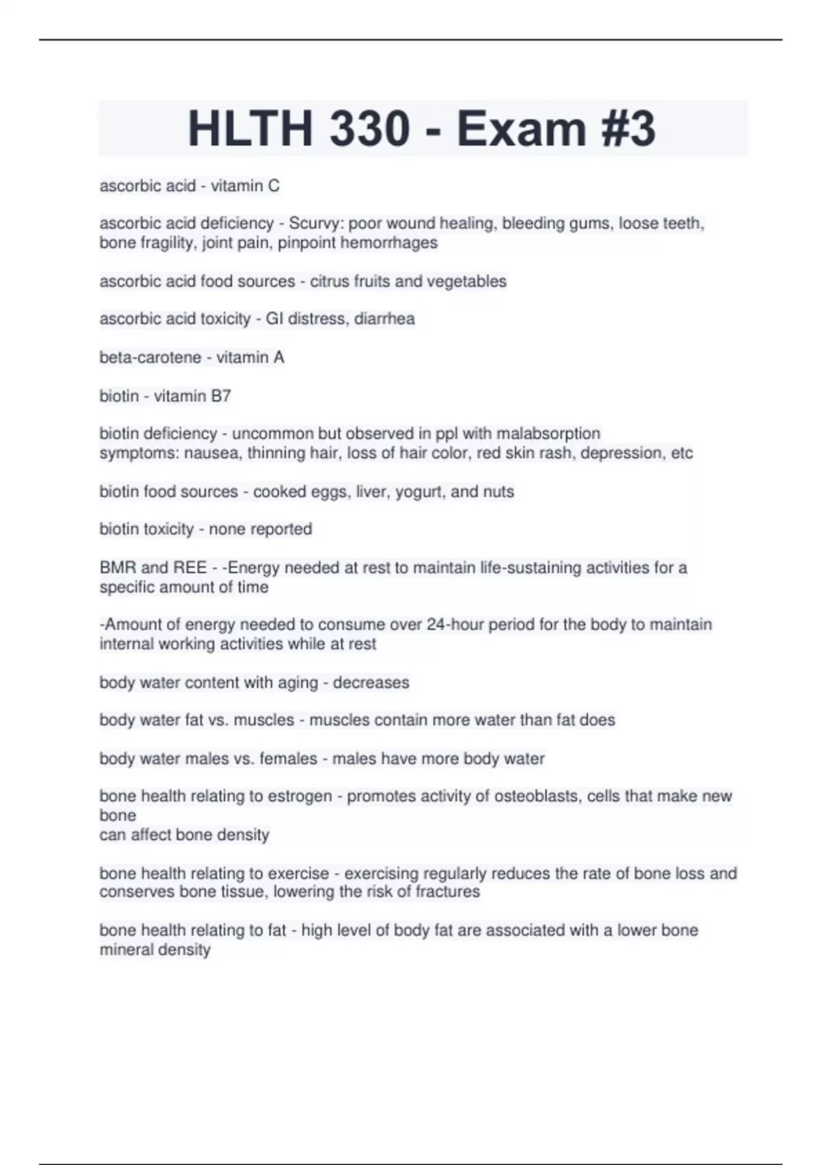 ascorbic acid - vitamin C ascorbic acid deficiency - Scurvy: poor wound healing, bleeding gums, loose teeth, bone fragility, joint pain, pinpoint hemorrhages ascorbic acid food sources - citrus fruits and vegetables ascorbic acid toxicity - GI distress, diarrhea beta-carotene - vitamin A biotin - vitamin B7 biotin deficiency - uncommon but observed in ppl with malabsorption symptoms: nausea, thinning hair, loss of hair color, red skin rash, depression, etc biotin food sources - cooked eggs, liver, yogurt, and nuts biotin toxicity - none reported BMR and REE - -Energy needed at rest to maintain life-sustaining activities for a specific amount of time -Amount of energy needed to consume over 24-hour period for the body to maintain internal working activities while at rest body water content with aging - decreases body water fat vs. muscles - muscles contain more water than fat does body water males vs. females - males have more body water bone health relating to estrogen - promotes activity of osteoblasts, cells that make new bone can affect bone density bone health relating to exercise - exercising regularly reduces the rate of bone loss and