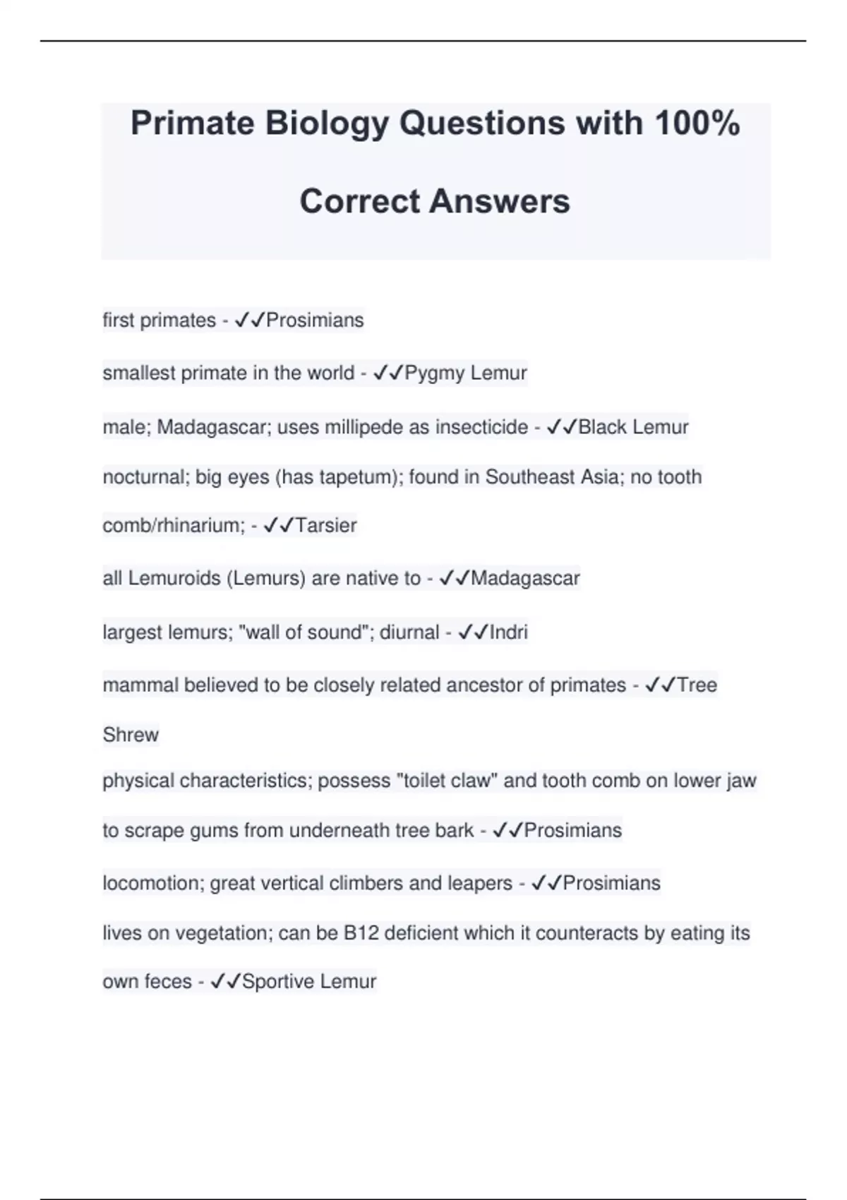 Primate Biology Questions with 100% Correct Answers first primates - Prosimians smallest primate in the world - Pygmy Lemur male; Madagascar; uses millipede as insecticide - Black Lemur nocturnal; big eyes (has tapetum); found in Southeast Asia; no tooth comb/rhinarium; - Tarsier all Lemuroids (Lemurs) are native to - Madagascar largest lemurs; "wall of sound"; diurnal - Indri mammal believed to be closely related ancestor of primates - Tree Shrew physical characteristics; possess "toilet claw" and tooth comb on lower jaw to scrape gums from underneath tree bark - Prosimians locomotion; great vertical climbers and leapers - Prosimians lives on vegetation; can be B12 deficient which it counteracts by eating its own feces - Sportive Lemur