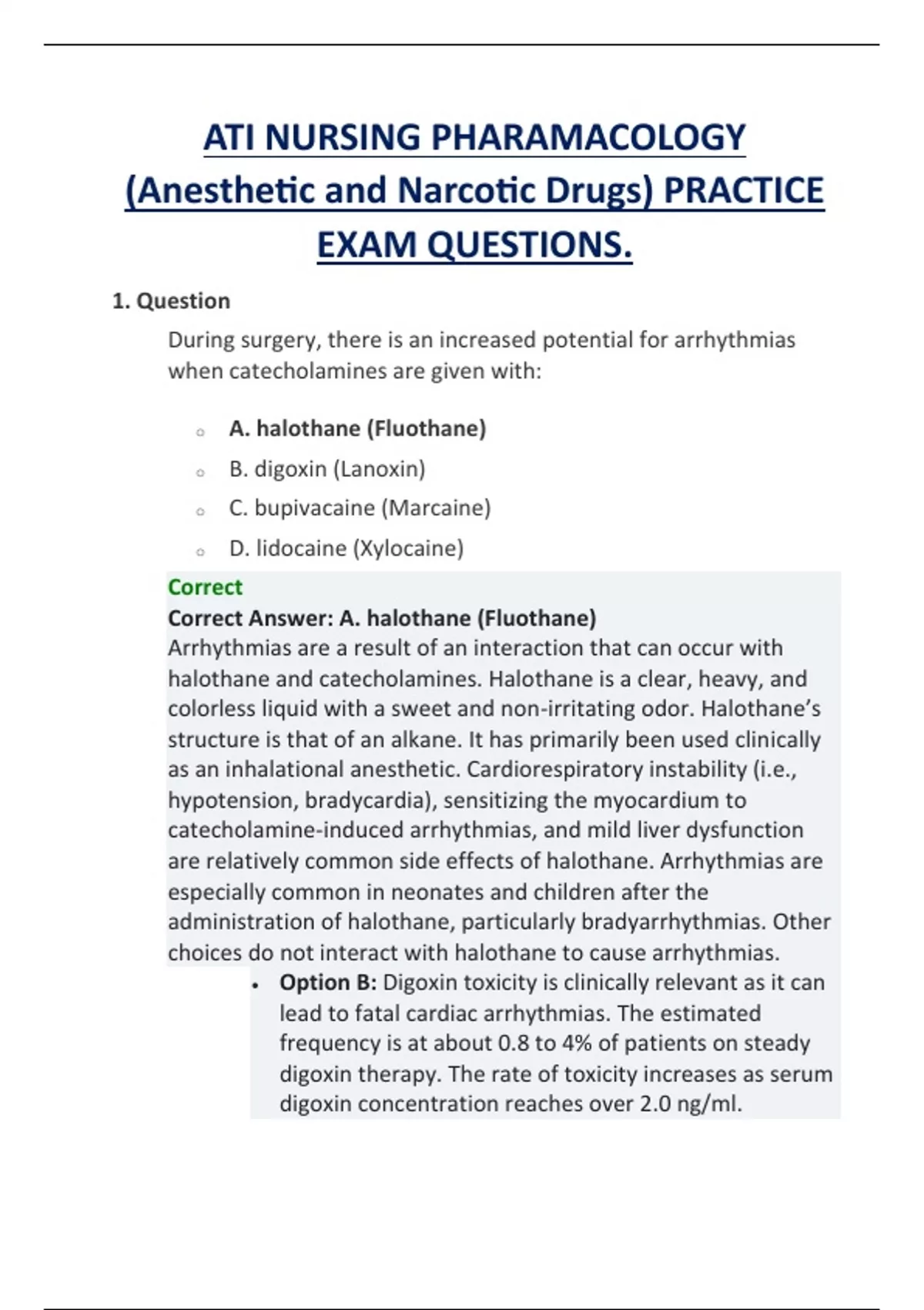 ATI PHARAMACOLOGY (Anesthetic and Narcotic Drugs) ACTUAL PRACTICE EXAM QUESTIONS.