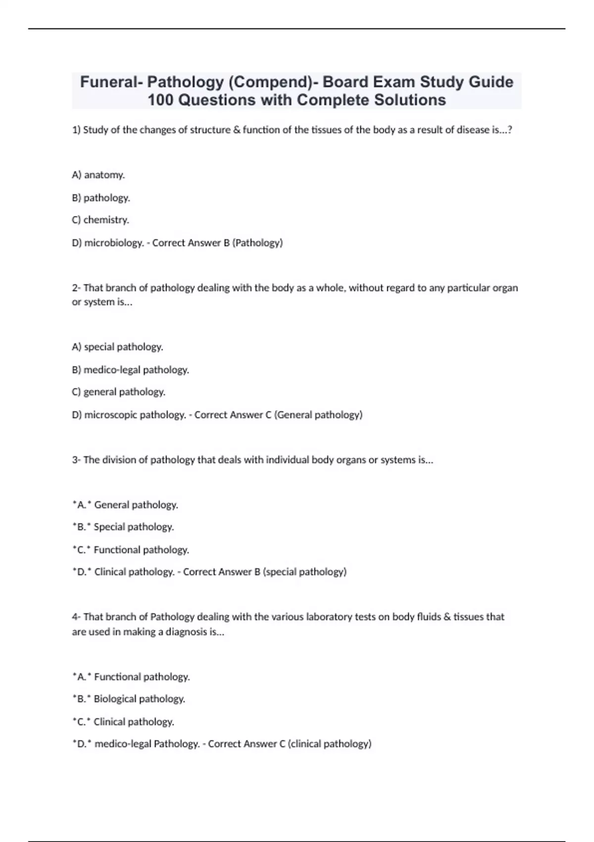 Funeral- Pathology (Compend)- Board Exam Study Guide 100 Questions with Complete Solutions 1) Study of the changes of structure & function of the tissues of the body as a result of disease is...? A) anatomy. B) pathology. C) chemistry. D) microbiology. - Correct Answer B (Pathology) 2- That branch of pathology dealing with the body as a whole, without regard to any particular organ or system is... A) special pathology. B) medico-legal pathology. C) general pathology. D) microscopic pathology. - Correct Answer C (General pathology) 3- The division of pathology that deals with individual body organs or systems is... *A.* General pathology. *B.* Special pathology. *C.* Functional pathology. *D.* Clinical pathology. - Correct Answer B (special pathology) 4- That branch of Pathology dealing with the various laboratory tests on body fluids & tissues that are used in making a diagnosis is... *A.* Functional pathology. *B.* Biological pathology. *C.* Clinical pathology. *D.* medico-legal Pathology. - Correct Answer C (clinical pathology