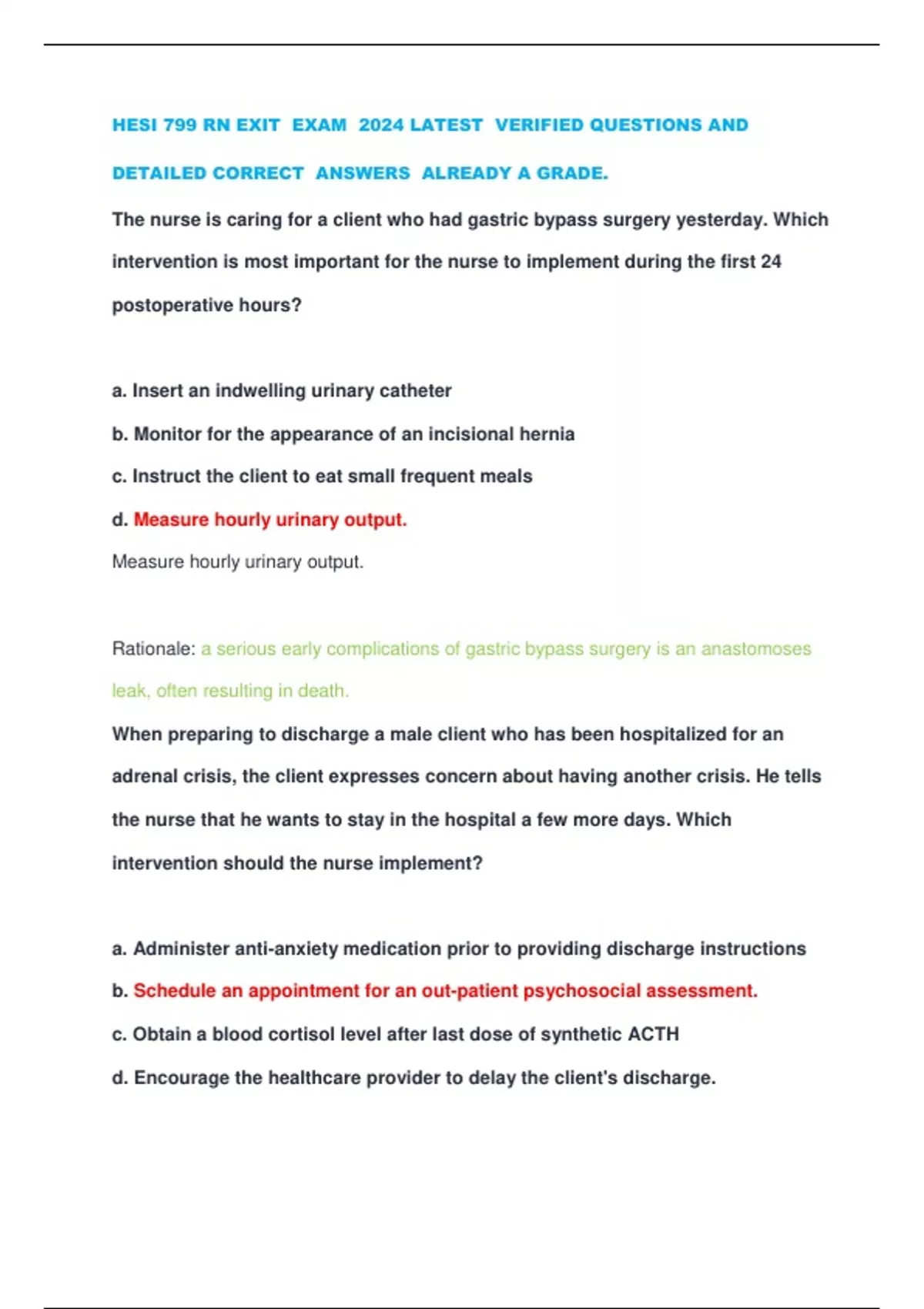 HESI 799 RN EXIT EXAM 2024 LATEST VERIFIED QUESTIONS AND DETAILED CORRECT ANSWERS ALREADY A GRADE. The nurse is caring for a client who had gastric bypass surgery yesterday. Which intervention is most important for the nurse to implement during the first 24 postoperative hours? a. Insert an indwelling urinary catheter b. Monitor for the appearance of an incisional hernia c. Instruct the client to eat small frequent meals d. Measure hourly urinary output. Measure hourly urinary output. Rationale: a serious early complications of gastric bypass surgery is an anastomoses leak, often resulting in death. When preparing to discharge a male client who has been hospitalized for an adrenal crisis, the client expresses concern about having another crisis. He tells the nurse that he wants to stay in the hospital a few more days. Which intervention should the nurse implement? a. Administer anti-anxiety medication prior to providing discharge instructions b. Schedule an appointment for an out-patient psychosocial assessment. c. Obtain a blood cortisol level after last dose of synthetic ACTH d. Encourage the healthcare provider to delay the client's discharge.