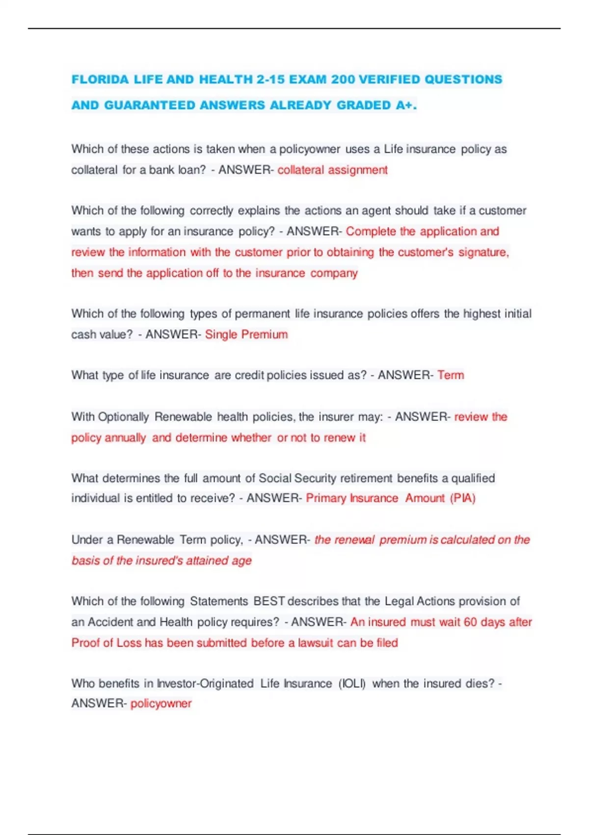 FLORIDA LIFE AND HEALTH 2-15 EXAM 200 VERIFIED QUESTIONS AND GUARANTEED ANSWERS ALREADY GRADED A+. Which of these actions is taken when a policyowner uses a Life insurance policy as collateral for a bank loan? - ANSWER- collateral assignment Which of the following correctly explains the actions an agent should take if a customer wants to apply for an insurance policy? - ANSWER- Complete the application and review the information with the customer prior to obtaining the customer's signature, then send the application off to the insurance company Which of the following types of permanent life insurance policies offers the highest initial cash value? - ANSWER- Single Premium What type of life insurance are credit policies issued as? - ANSWER- Term With Optionally Renewable health policies, the insurer may: - ANSWER- review the policy annually and determine whether or not to renew it What determines the full amount of Social Security retirement benefits a qualified individual is entitled to receive? - ANSWER- Primary Insurance Amount (PIA) Under a Renewable Term policy, - ANSWER- the renewal premium is calculated on the basis of the insured's attained age Which of the following Statements BEST describes that the Legal Actions provision of an Accident and Health policy requires? - ANSWER- An insured must wait 60 days after Proof of Loss has been submitted before a lawsuit can be filed Who benefits in Investor-Originated Life Insurance (IOLI) when the insured dies? - ANSWER- policyowner