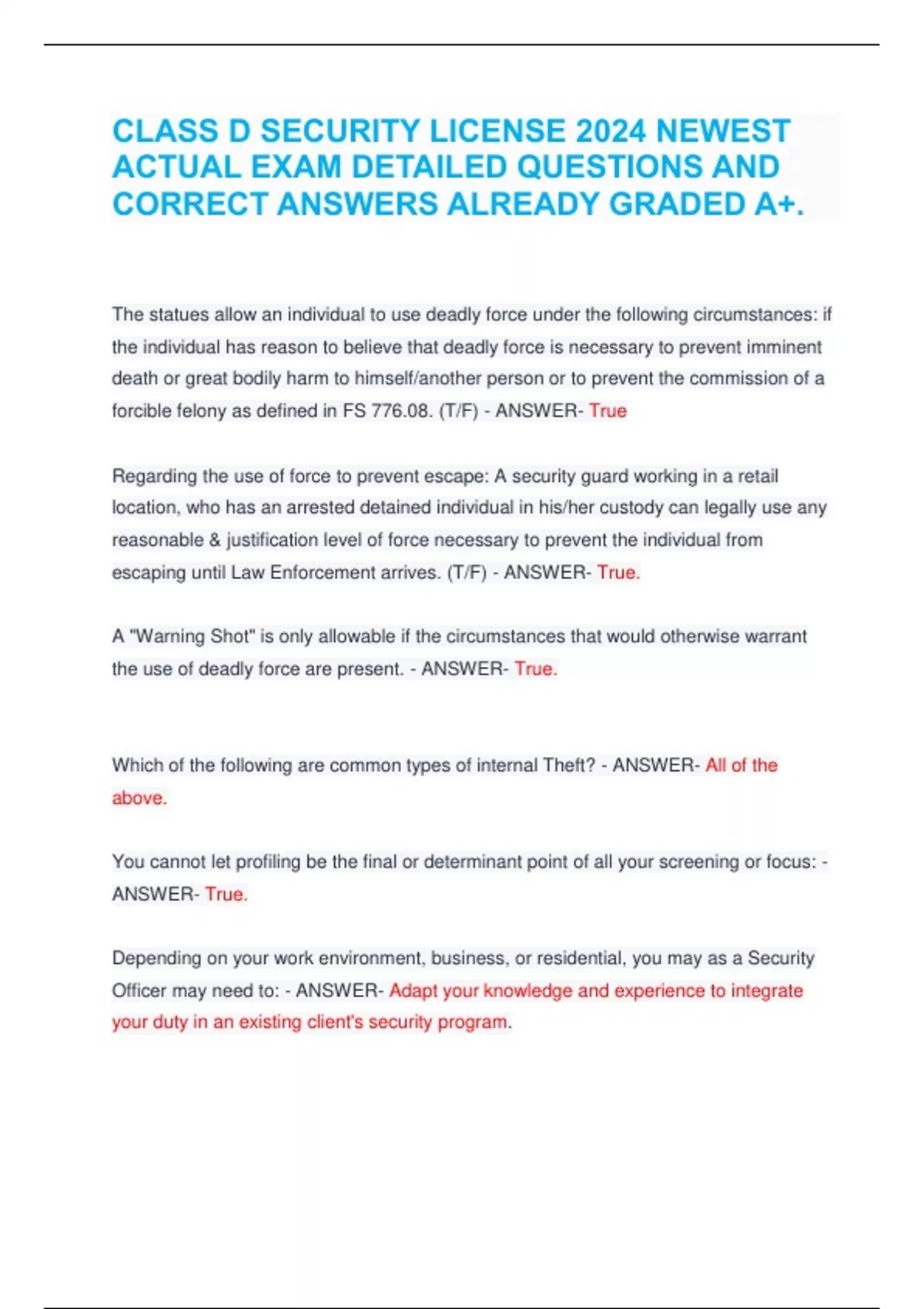 CLASS D SECURITY LICENSE 2024 NEWEST ACTUAL EXAM DETAILED QUESTIONS AND CORRECT ANSWERS ALREADY GRADED A+.