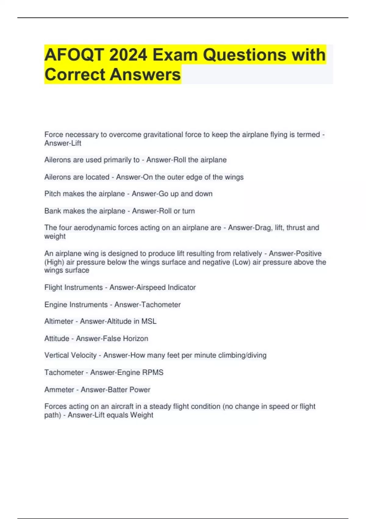 AFOQT 2024 Exam Questions with Correct Answers Force necessary to overcome gravitational force to keep the airplane flying is termed - Answer-Lift Ailerons are used primarily to - Answer-Roll the airplane Ailerons are located - Answer-On the outer edge of the wings Pitch makes the airplane - Answer-Go up and down Bank makes the airplane - Answer-Roll or turn The four aerodynamic forces acting on an airplane are - Answer-Drag, lift, thrust and weight An airplane wing is designed to produce lift resulting from relatively - Answer-Positive (High) air pressure below the wings surface and negative (Low) air pressure above the wings surface Flight Instruments - Answer-Airspeed Indicator Engine Instruments - Answer-Tachometer Altimeter - Answer-Altitude in MSL Attitude - Answer-False Horizon Vertical Velocity - Answer-How many feet per minute climbing/diving Tachometer - Answer-Engine RPMS Ammeter - Answer-Batter Power Forces acting on an aircraft in a steady flight condition (no change in speed or flight path) - Answer-Lift equals Weight A flashing green air traffic control signal directed to an aircraft on the surface is a signal that the pilot - Answer-Is cleared to taxi Steady red light signal from the tower to aircraft approaching to land - Answer-Continue circling Flashing red light signal from the tower to aircraft approaching to land - Answer-Airport is unsafe for landing Propeller blades are curved on one side and flat on the other side to - Answer-Produce thrust When in the down (extended) position wingflaps provide - Answer-Greater lift and more drag What makes an airplane turn - Answer-Horizontal componenet of lift What is one advantage of an airplane said to be inherently stable - Answer-Airplane will require less effort to control If the elevator trim tabs on the airplane are lowered, the plane will tend to - AnswerNose up The pilot always advances the throttle during a - Answer-Climb The pilot of an airplane can best detect the approach of a stall by the - AnswerIneffectiveness of the ailerons and elevator It is ordinarily desirable to provide an unusually long flight strip at municipal airports for the take-off of - Answer-Heavily loaded ships in still air A closed runway is marked on an airfield diagram with - Answer-X X X Over run is marked on an airfield diagram with - Answer->>> The rearward retarding force of airplane drag is opposed by - Answer-Thrust Cowling is located - Answer-Around the engine Airport taxiways are identified at night by omni directional edge lights in what color - Answer-Blue