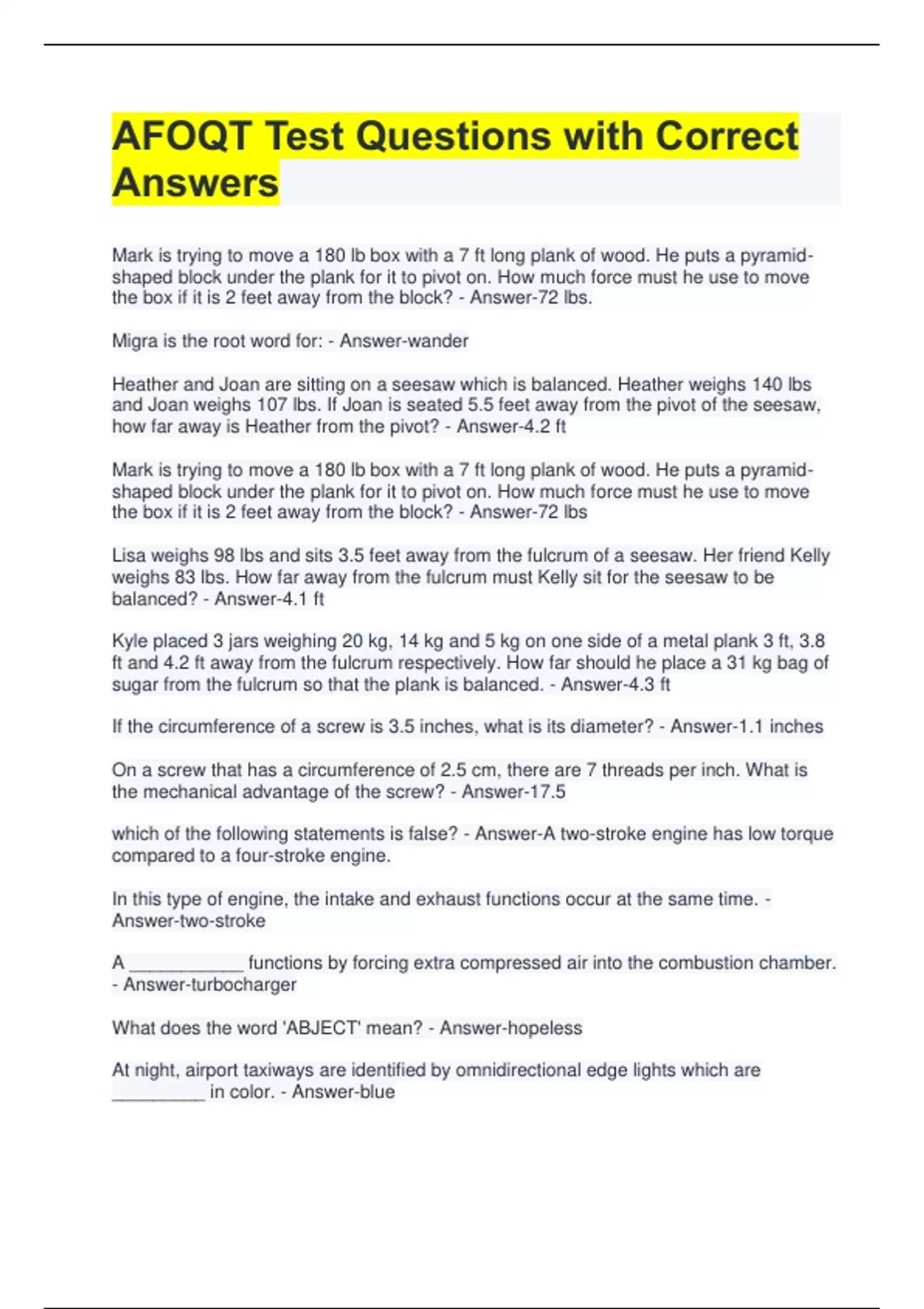 AFOQT Test Questions with Correct Answers Mark is trying to move a 180 lb box with a 7 ft long plank of wood. He puts a pyramidshaped block under the plank for it to pivot on. How much force must he use to move the box if it is 2 feet away from the block? - Answer-72 lbs. Migra is the root word for: - Answer-wander Heather and Joan are sitting on a seesaw which is balanced. Heather weighs 140 lbs and Joan weighs 107 lbs. If Joan is seated 5.5 feet away from the pivot of the seesaw, how far away is Heather from the pivot? - Answer-4.2 ft Mark is trying to move a 180 lb box with a 7 ft long plank of wood. He puts a pyramidshaped block under the plank for it to pivot on. How much force must he use to move the box if it is 2 feet away from the block? - Answer-72 lbs Lisa weighs 98 lbs and sits 3.5 feet away from the fulcrum of a seesaw. Her friend Kelly weighs 83 lbs. How far away from the fulcrum must Kelly sit for the seesaw to be balanced? - Answer-4.1 ft Kyle placed 3 jars weighing 20 kg, 14 kg and 5 kg on one side of a metal plank 3 ft, 3.8 ft and 4.2 ft away from the fulcrum respectively. How far should he place a 31 kg bag of sugar from the fulcrum so that the plank is balanced. - Answer-4.3 ft If the circumference of a screw is 3.5 inches, what is its diameter? - Answer-1.1 inches On a screw that has a circumference of 2.5 cm, there are 7 threads per inch. What is the mechanical advantage of the screw? - Answer-17.5 which of the following statements is false? - Answer-A two-stroke engine has low torque compared to a four-stroke engine. In this type of engine, the intake and exhaust functions occur at the same time. - Answer-two-stroke A ___________ functions by forcing extra compressed air into the combustion chamber. - Answer-turbocharger What does the word 'ABJECT' mean? - Answer-hopeless At night, airport taxiways are identified by omnidirectional edge lights which are _________ in color. - Answer-blue