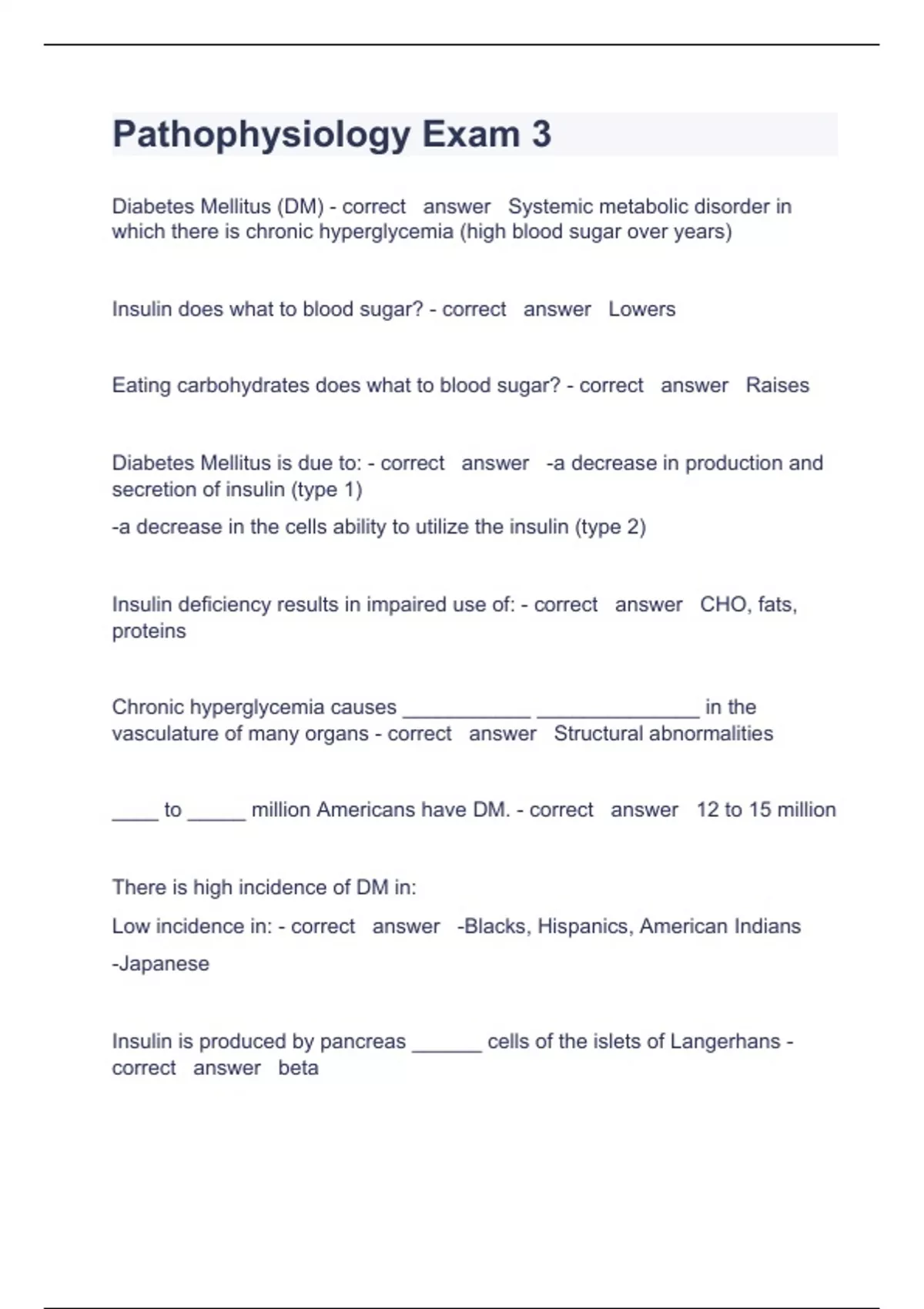 Pathophysiology Exam 3 Question and answers correctly solved 2024 Pathophysiology Exam 3 Diabetes Mellitus (DM) - correct answer Systemic metabolic disorder in which there is chronic hyperglycemia (high blood sugar over years) Insulin does what to blood sugar? - correct answer Lowers Eating carbohydrates does what to blood sugar? - correct answer Raises Diabetes Mellitus is due to: - correct answer -a decrease in production and secretion of insulin (type 1) -a decrease in the cells ability to utilize the insulin (type 2) Insulin deficiency results in impaired use of: - correct answer CHO, fats, proteins