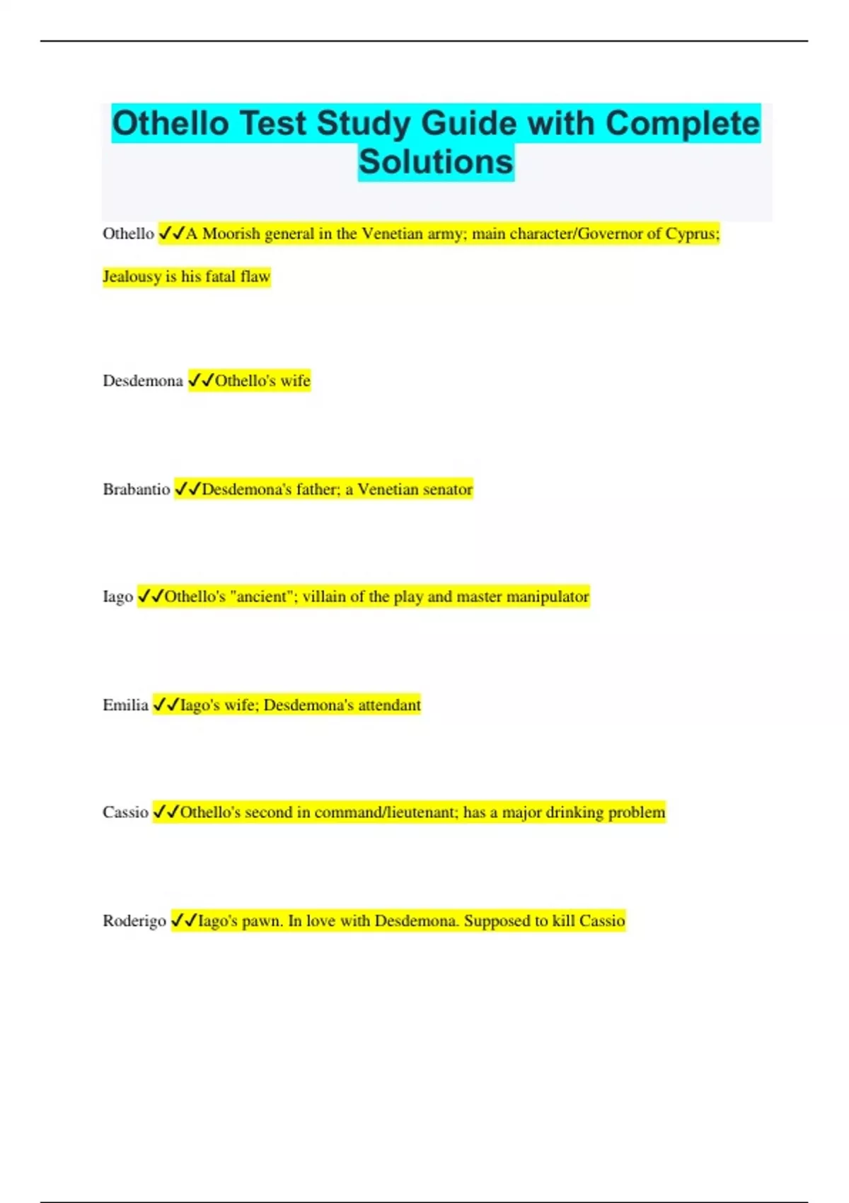 Othello Test Study Guide with Complete Solutions Othello A Moorish general in the Venetian army; main character/Governor of Cyprus; Jealousy is his fatal flaw Desdemona Othello's wife Brabantio Desdemona's father; a Venetian senator Iago Othello's "ancient"; villain of the play and master manipulator Emilia Iago's wife; Desdemona's attendant Cassio Othello's second in command/lieutenant; has a major drinking problem Roderigo Iago's pawn. In love with Desdemona. Supposed to kill Cassio Lodovico Venetian gentleman; kinsmen to Brabantio. Witnessed Othello striking Desdemona Gratiano Venetian gentleman & kinsman to Brabantio; Montano Official in Cyprus that is stabbed by Cassio when Cassio gets drunk Bianca Prostitute that Cassio has a relationship with What was Iago's complaint in Act 1 Scene I? Othello made Cassio lieutenant instead of him Why did Iago and Roderigo awaken Brabantio in the middle of the night? To tell him Desdemona has eloped with Othello Why did Iago leave Roderigo at Brabantio's house? To conceal his identity so no one knew he told Brabantio about the marriage; to warn Othello in order to gain favor with him What was Brabantio's reaction to Othello's marriage to Desdemona? He doesn't approve and believes Othello has bewitched Desdemona. Why did the Duke send for Othello? He wants Othello to go to Cyprus and stop the Turkish fleet that is preparing to attack it. What does the Duke tell Brabantio about Othello and Desdemona's marriage? He thinks Othello is a good man and that the couple is in love so Brabantio should accept it. What was Roderigo's complaint and what was Iago's reply? Roderigo complains that Desdemona doesn't love him and that he doesn't want to live without her. Iago tells him to "put money in thy purse" and come with him to Cyprus to get her back. Why did Iago want Roderigo to anger Cassio? He believes the fight will disgrace Cassio and get him in trouble with Othello. What was the purpose of Iago's plan? To get Cassio fired so Iago can get the title. He wants to get back at Othello. Why did Iago want Cassio to drink more wine? Because Cassio has a drinking problem and will be easier to disgrace while drunk. What lie did Iago tell Montano about Cassio? He cares for Cassio and wants to help him with his severe drinking problem, because he is drunk all the time. Why did Othello strip Cassio of his rank? Because Cassio got into a drunken fight with Montano and stabbed him. Why did Iago want Cassio to ask Desdemona for help in restoring Othello's faith in Cassio? So he could make Othello believe Cassio and Desdemona