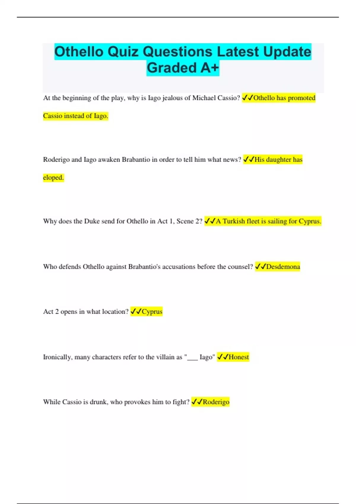 Othello Quiz Questions Latest Update Graded A+ At the beginning of the play, why is Iago jealous of Michael Cassio? Othello has promoted Cassio instead of Iago. Roderigo and Iago awaken Brabantio in order to tell him what news? His daughter has eloped. Why does the Duke send for Othello in Act 1, Scene 2? A Turkish fleet is sailing for Cyprus. Who defends Othello against Brabantio's accusations before the counsel? Desdemona Act 2 opens in what location? Cyprus Ironically, many characters refer to the villain as "___ Iago" Honest While Cassio is drunk, who provokes him to fight? Roderigo What is Cassio's punishment for brawling with Montano? He is demoted. Why does Iago encourage Cassio to approach Desdemona at the end of Act 2? To ask her to plead with Othello on his behalf. In Act 3, Scene 3, Othello warns Iago, "Make me to see't, or at the least so prove it/That the probation bear no hinge nor loop/ To hang a doubt on, or woe upon thy life!" What does he demand that Iago prove? That Desdemona is unfaithful. In Act 3, Scene 3, Othello complains of a headache, and Desdemona offers him her handkerchief. What does Othello do with the handkerchief? Sets it aside and lets it fall. In Act 4, Scene 1, Othello hides, eavesdropping on Cassio and Iago's conversation. Cassio tells of his sexual exploits with whom? Bianca When Ludovico arrives in Act 4, Scene 1, what does he deliver to Othello? A letter Toward the end of Act 4, Scene 1, what does Othello do that so appalls Ludovico? Othello strikes Desdemona Toward the end of Act 4, Scene 2, who approaches Iago saying, "I have heard too much, for your words/ and performances are no kin together"? Roderigo As Emilia prepares Desdemona for bed at the end of Act 4, Desdemona sings a song she learned from her mother's maid. What is the prominent symbol of this song? A willow tree In the opening scene of Act 5, Iago wounds Cassio and kills whom? Roderigo While tending to the wounded Cassio, Iago repeatedly tries to divert attention (and therefore guilt) toward which character? Bianca How does Othello kill Desdemona? Smothers her What does Iago do to his wife, Emilia, toward the end of Act 5, Scene 2? Iago kills Emilia In the final pages, what evidence does Ludovico produce that incriminates Iago? Iago's letters addressed to Roderigo